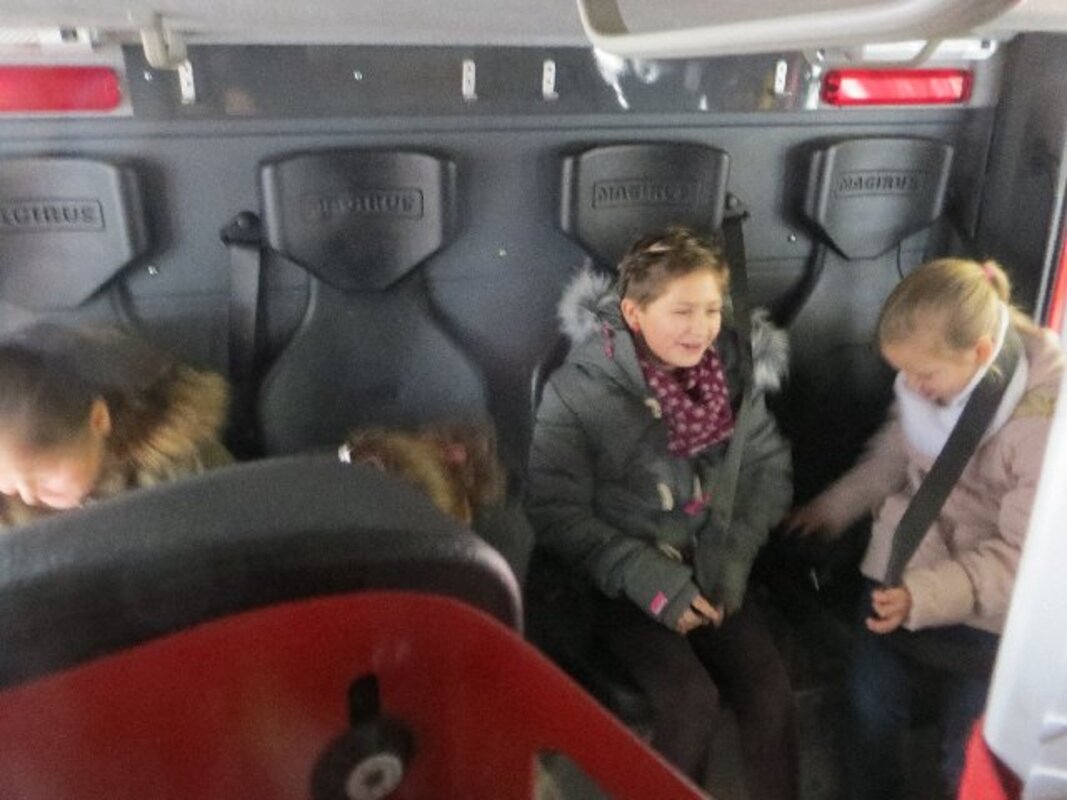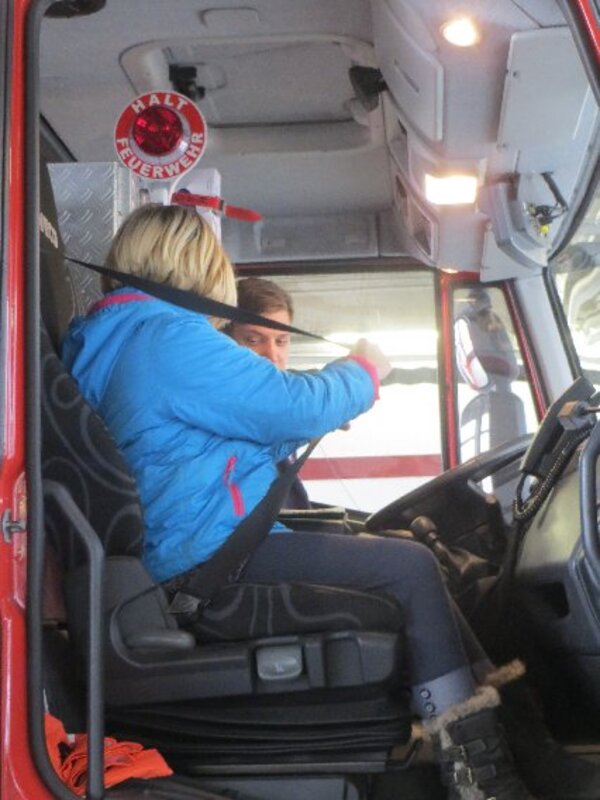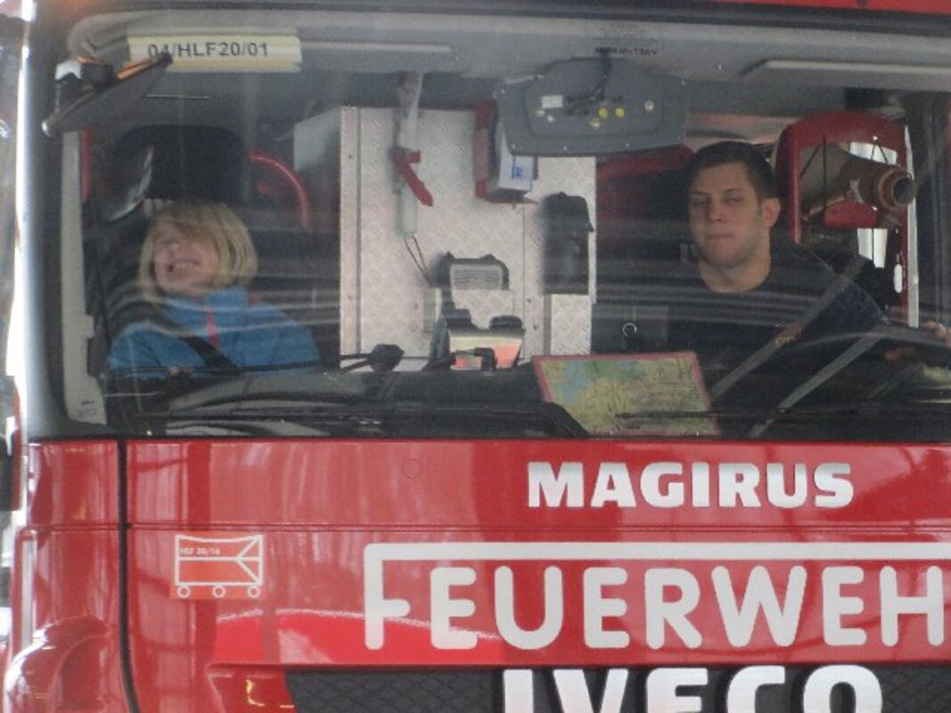 Höhepunkt war für die Kinder natürlich die Fahrt mit dem Feuerwehrfahrzeug mit eingeschaltetem Blaulicht. Ein Mädchen durfte sogar vorne beim Fahrer sitzen. Nichts für Mädchen? Pustekuchen! Bei der Feuerwehr Duisburg gibt es auch weibliche Feuerwehrfrauen.