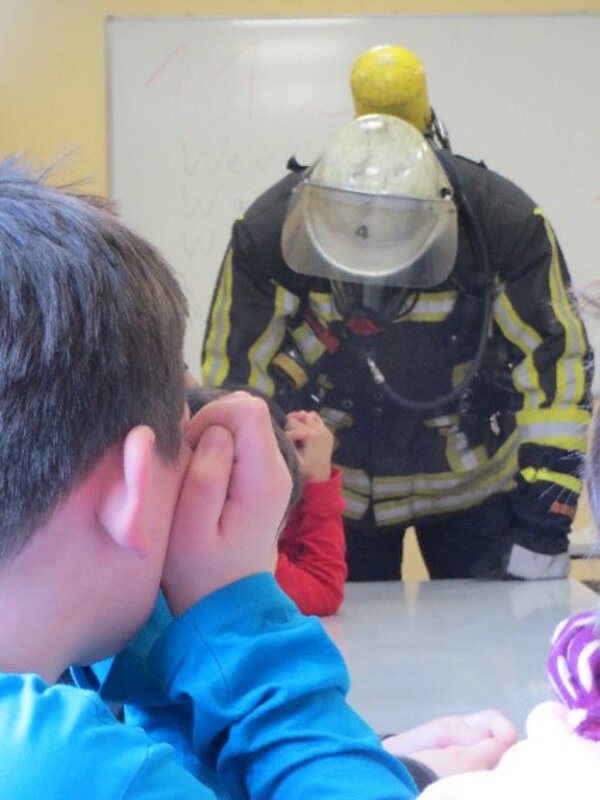 Was alles zu einer Feuerwehrausrüstung gehört, wie man sich im Notfall richtig verhält, vor allem wie man eine richtige und vollständige Telefonmeldung abgibt, das war Thema beim Besuch der Viertklässler, dei schon im Sachunterricht darüber gesprochen hatten.