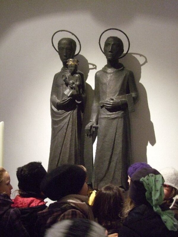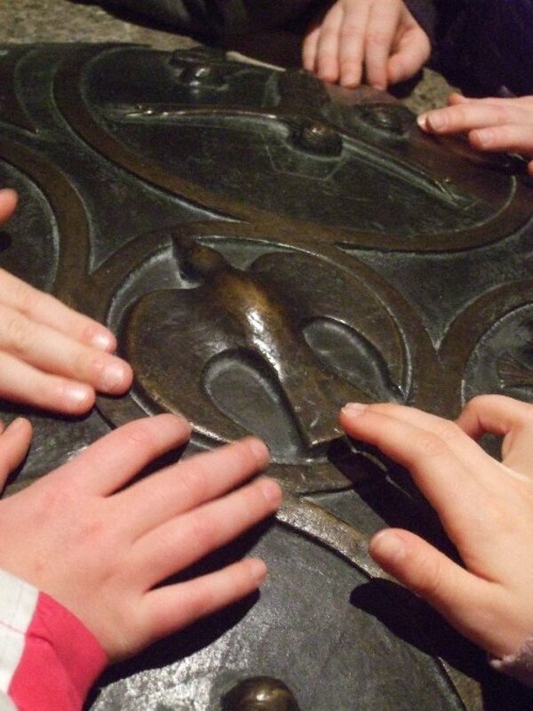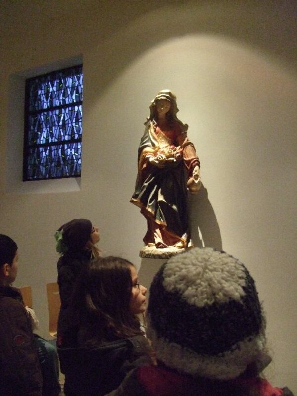 Eine andere Figur erinnerte die Kinder an ein Ausstellugnsstück im stadthistorischen Museum. Jesus ist in der Elisabethkirche auf dem Arm seiner Mutter Maria und neben Marias Mann Josef zu finden. In einer Hand hält er eine Kugel und die andere Hand hebt er zum Gruß. Im stadthistorischen Museum ist eine Figur von Jesus wo er als Erwachsene die Weltkugel hält und mit der anderen Hand ein Friedenszeichen macht.
