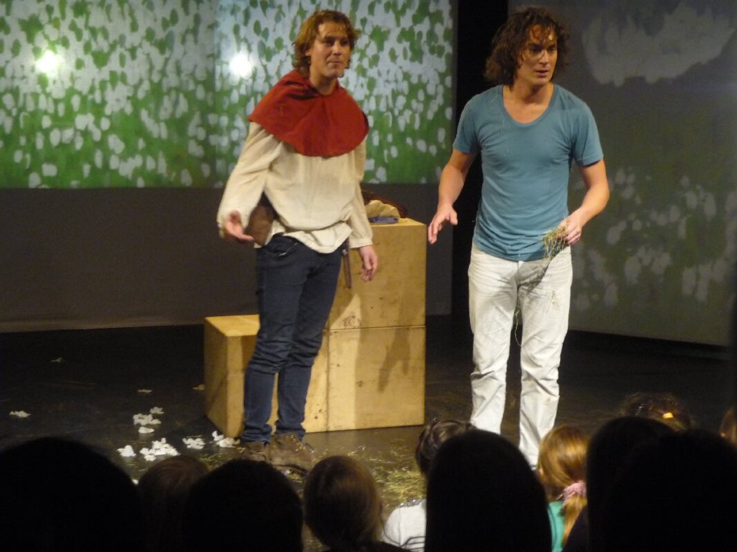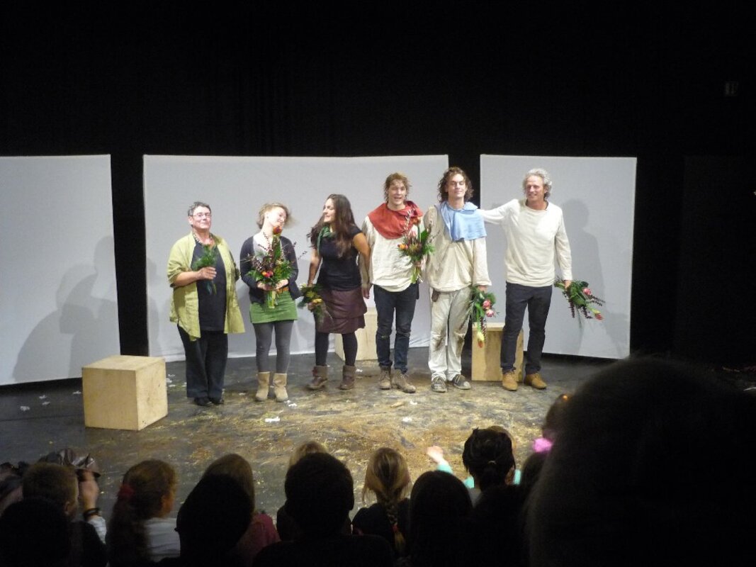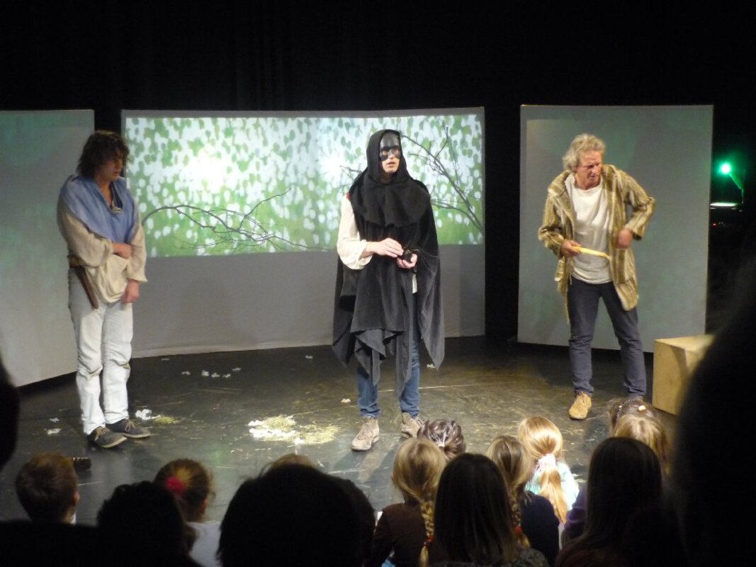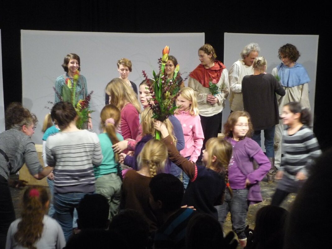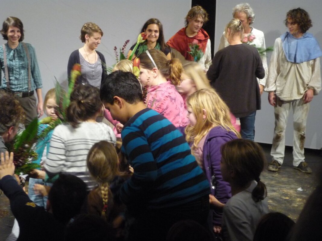 Der zweite Kulturforscherausflug in diesem Schuljahr war in mehrerer Hinsicht ungewöhnlich. Diesmal fuhren die Kinder mit einer ganzen Gruppe von Eltern an einem Samstagabend los. Ziel war das KOMMA-Theater in Duisburg-Rheinhausen. Am 26.11.2011 lud das Reibekuchentheater zur Theaterpremiere des Stückes "Brüder Löwenherz" nach dem Kinderbuch von Astrid Lindgren ein. Das für Kinder ab 12 Jahre gedachte Kinderbuch fesselte auf der Bühne aber auch viele unserer jüngeren Kulturforscherkinder. Ganz nah an den Schauspielern, fast auf der Bühne sitzend, erlebten sie die Abenteuer von Karl und Jonathan Löwenherz. Am Ende durften die Kinder den Schauspielern Blumen für ihre tolle Darbietung überreichen.