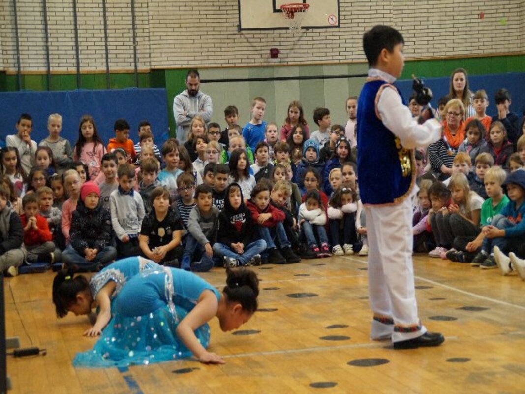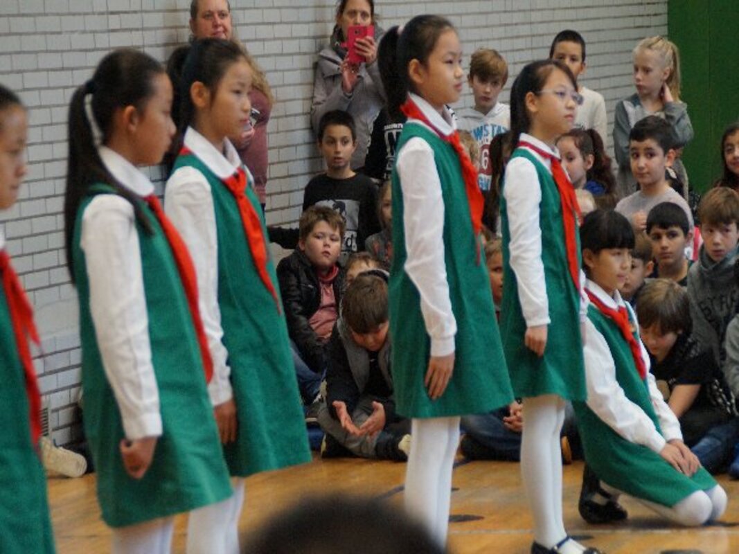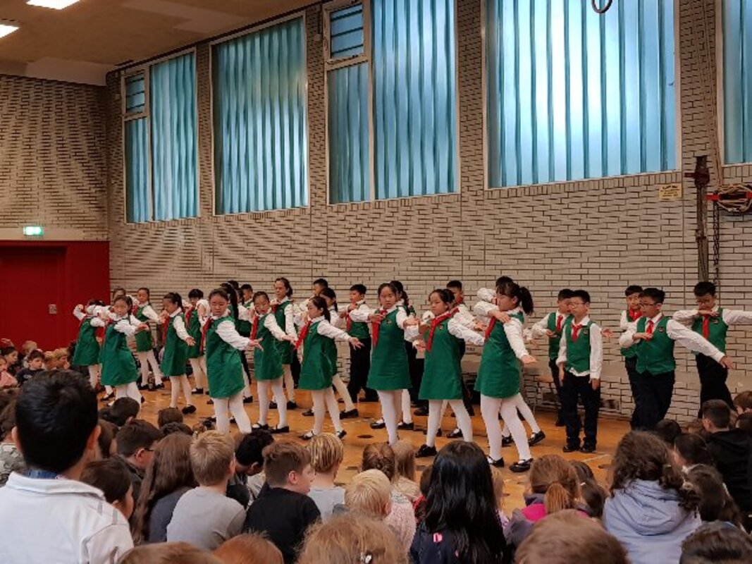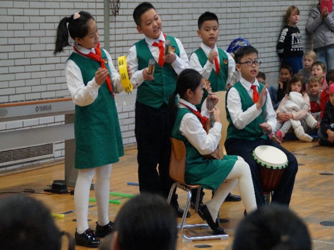 Unsere chinesischen Gäste bedankten sich mit einem halbstündigen Programm in der Turnhalle unserer Schule. Die 220 zuschauenden Kinder aus unseren 2. bis 4.Klassen staunten über das was uns die Kinder aus Wuhan präsentierten: Traditionelle chinesiche Instrumente wurden gespielt, es wurden chinesiche Volkslieder und Tänze aufgeführt, aber auch eine Tanzvorführung, die sich die Kinder selber zu westlicher Popmusik ausgedacht hatten.