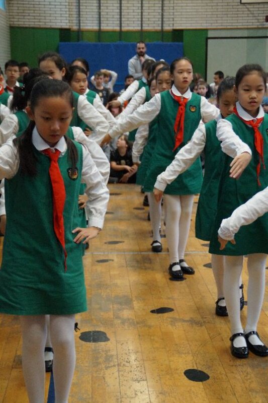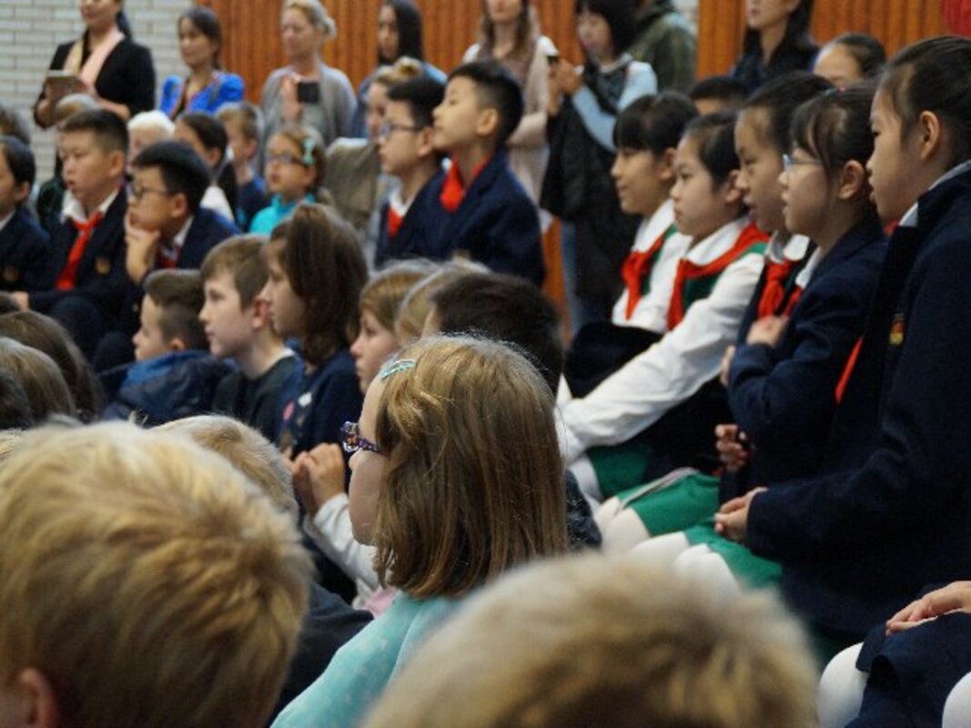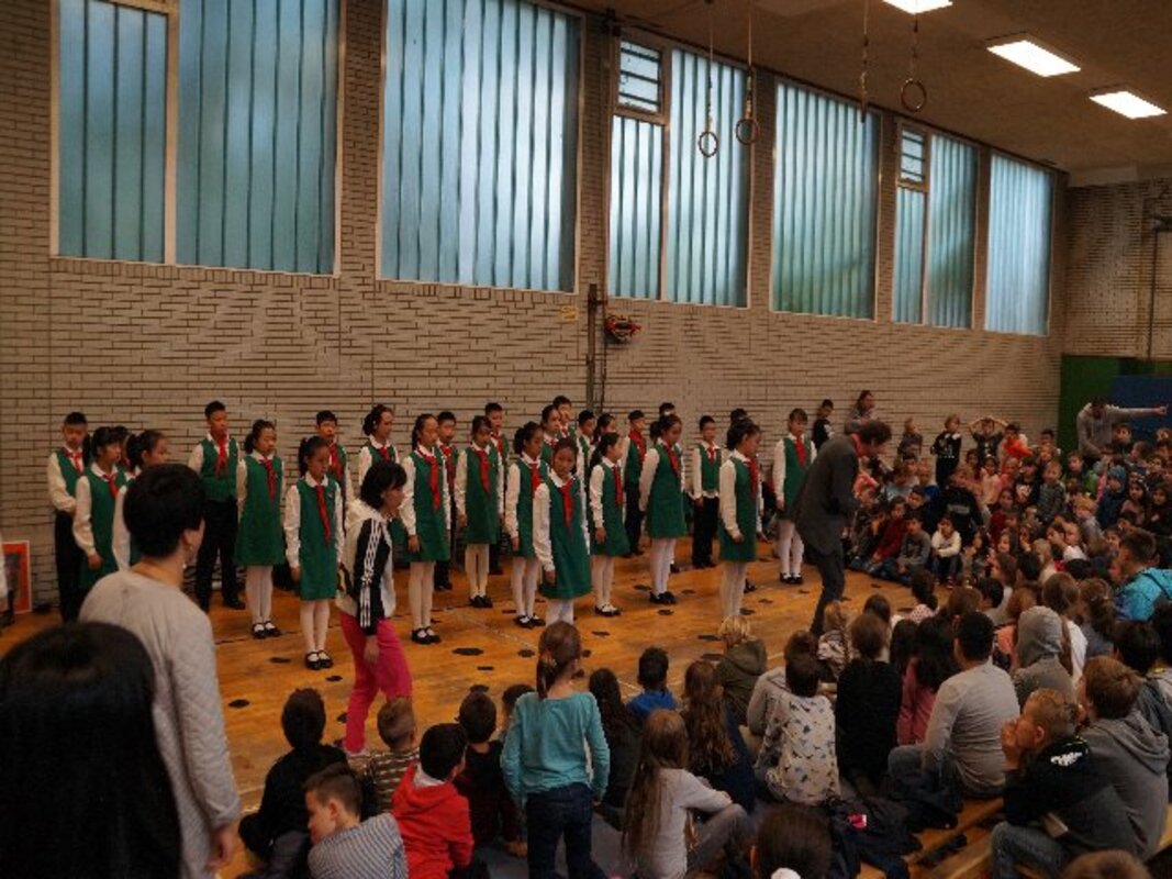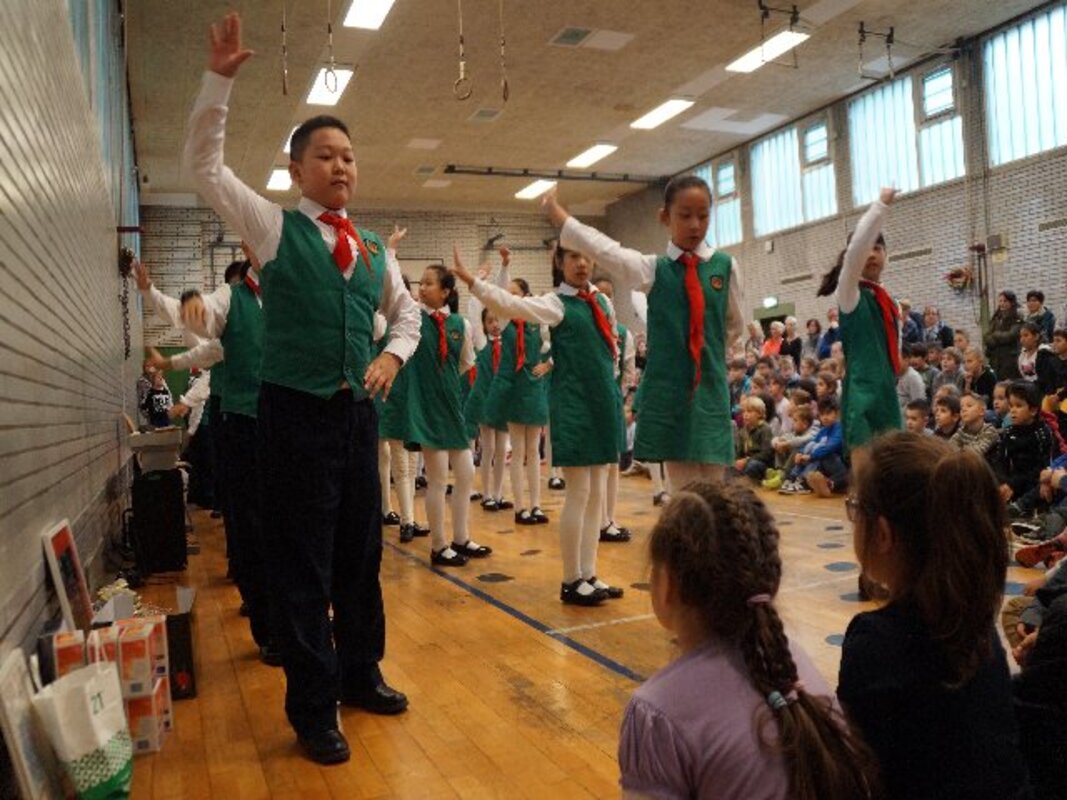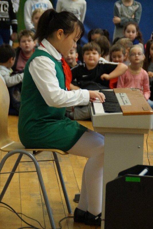 Unsere chinesischen Gäste bedankten sich mit einem halbstündigen Programm in der Turnhalle unserer Schule. Die 220 zuschauenden Kinder aus unseren 2. bis 4.Klassen staunten über das was uns die Kinder aus Wuhan präsentierten: Traditionelle chinesiche Instrumente wurden gespielt, es wurden chinesiche Volkslieder und Tänze aufgeführt, aber auch eine Tanzvorführung, die sich die Kinder selber zu westlicher Popmusik ausgedacht hatten.