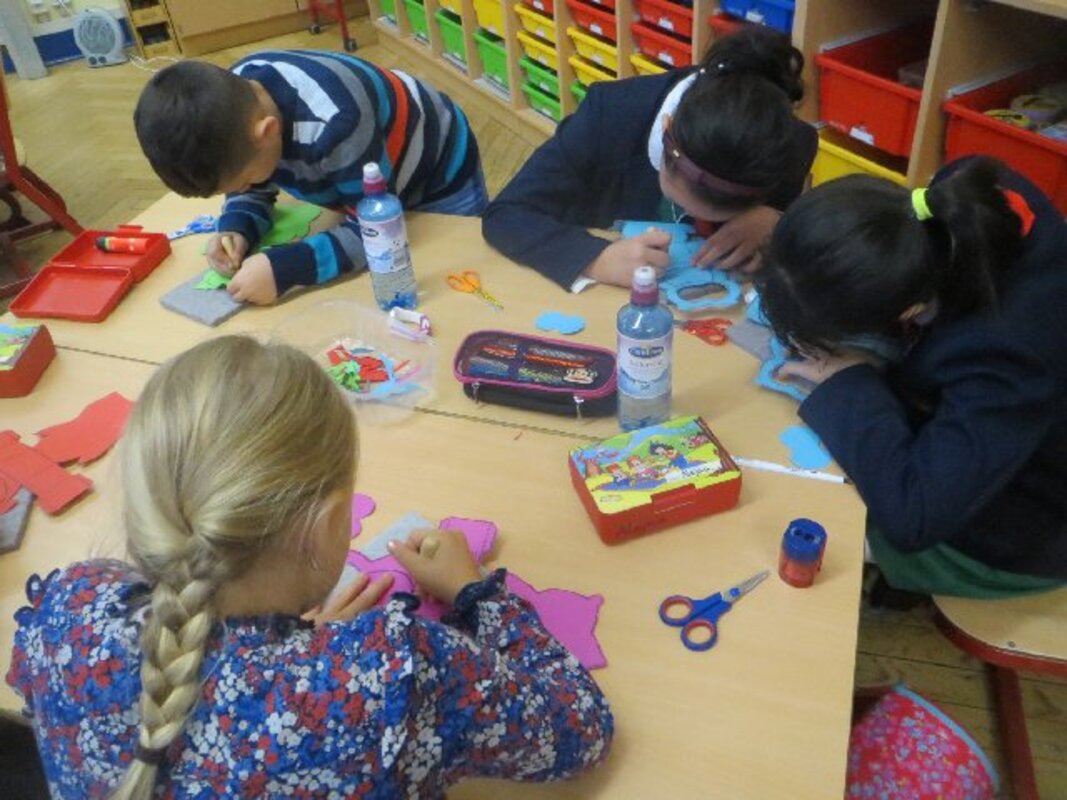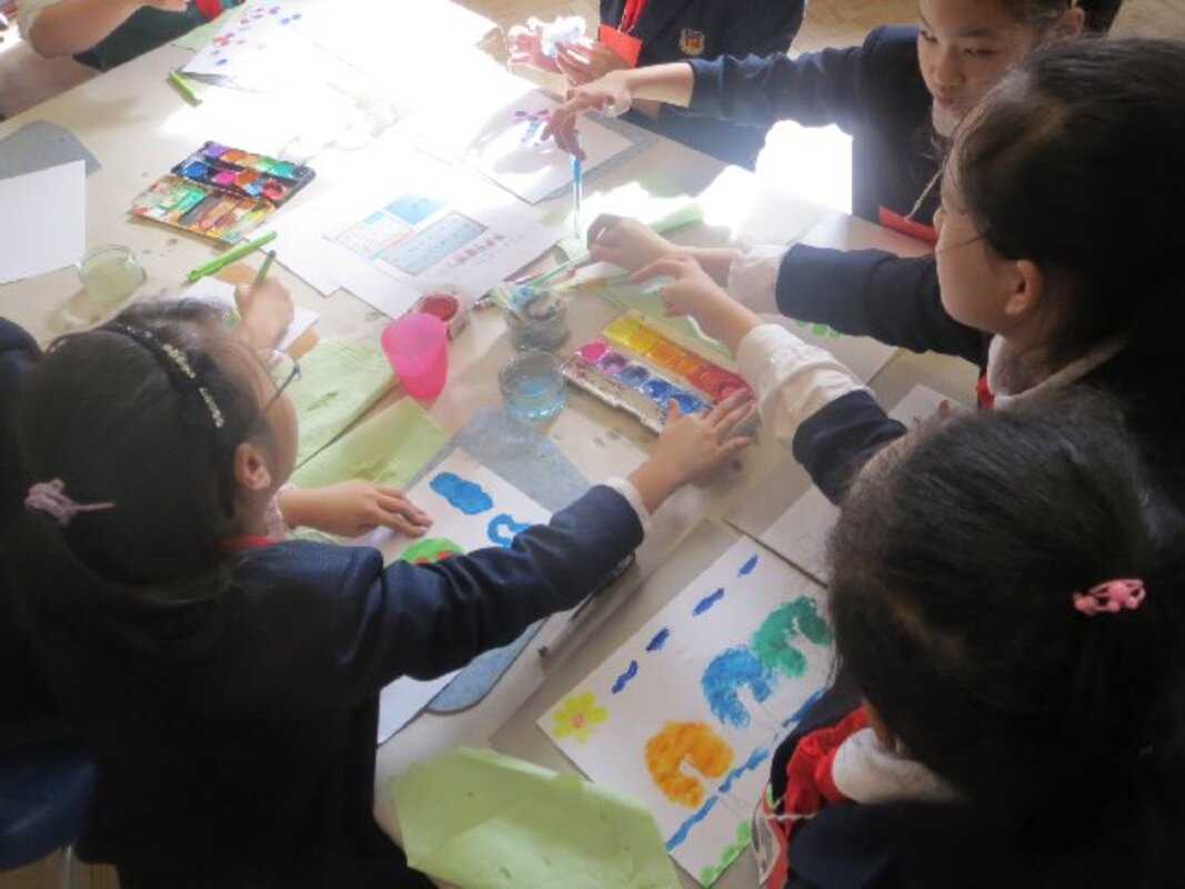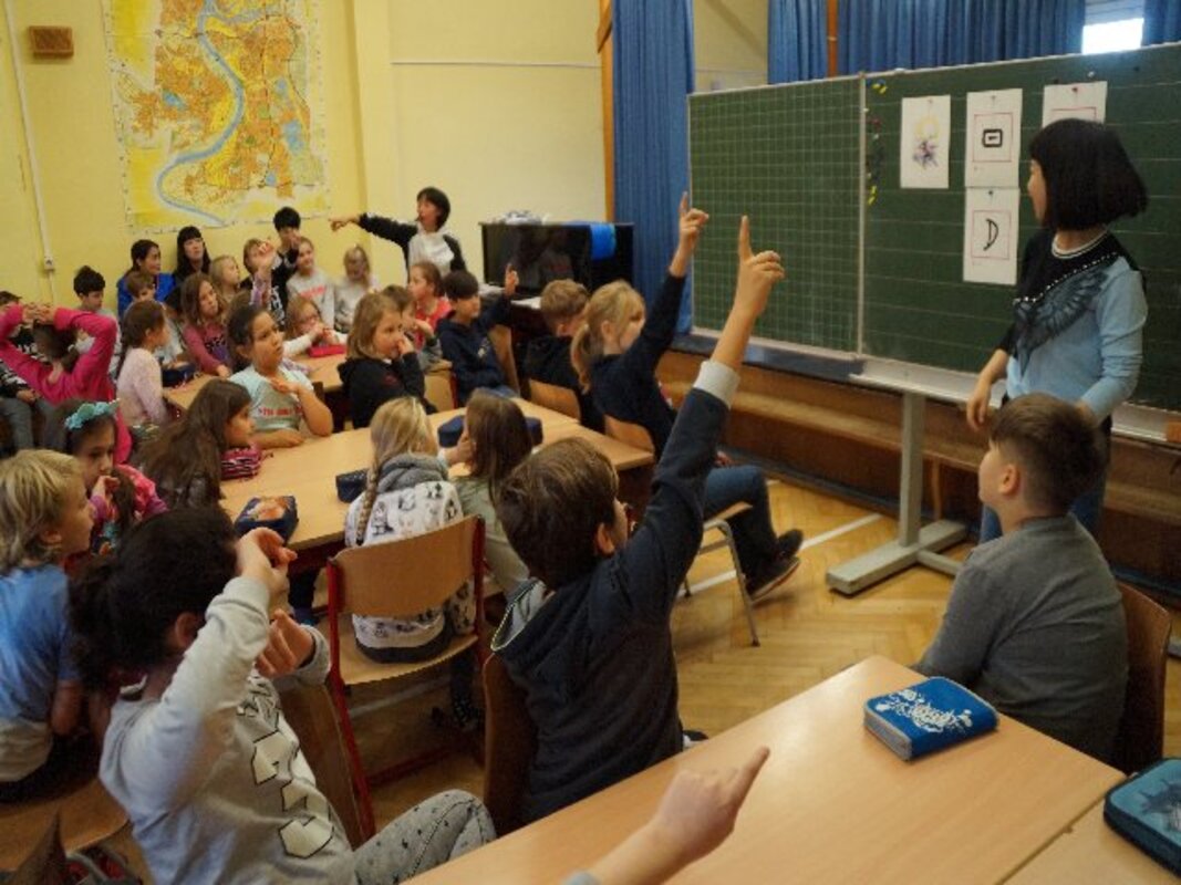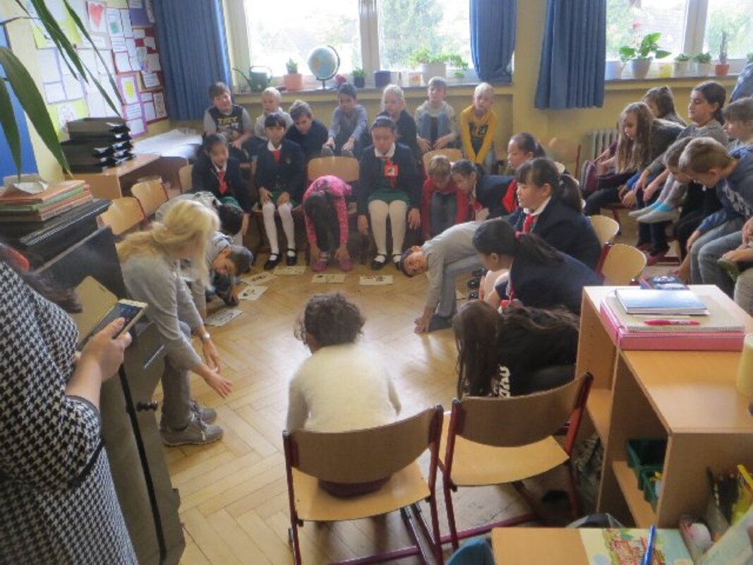 Am Donnerstag, den 5.10.2017 hatten wir extra Unterricht vorbereitet, an dem die Gastkidner besonders aktiv mit unseren Kinder gemeinsam etwas lernen oder tun konnten: Sport in der Turnhalle, Singen eines englischen Liedes zur Klavierbegleitung und Drucken mit Farben und Fingern.