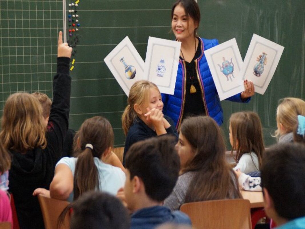 Am Freitag, den 6.10.2017 gaben drei chinesische Lehrerinnen in der Aula der Schule mehr als 70 Kindern gleichzeitig eine Einführung in die Entstehung chinesischer Schriftzeichen.
