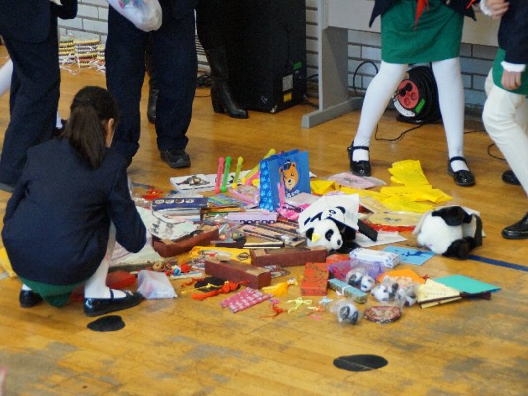 Zum Abschluss wurden Gastgeschenke an uns als Schule überreicht: Tintenfässchen und chinesische Schreibfedern für die Schulklassen und vielerlei kleinere Geschenke, die die Kinder einzeln mitgebracht hatten.