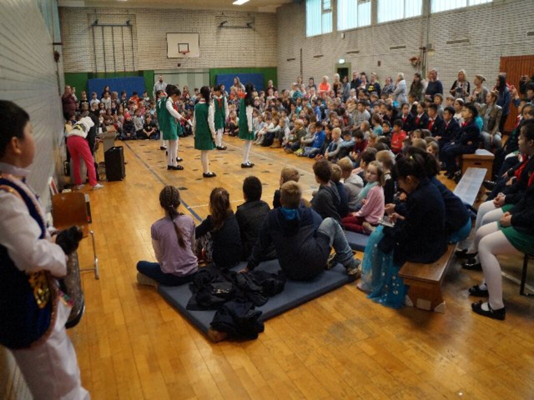 Am Donnerstag, den 5.10.2017 begrüßten zunächst einmal Kinder der 3a mit zwei deutschen Herbstliedern die Gäste. Danach sangen und tanzten zwei 2.Schuljahre Lieder in englischer Sprache vor.
