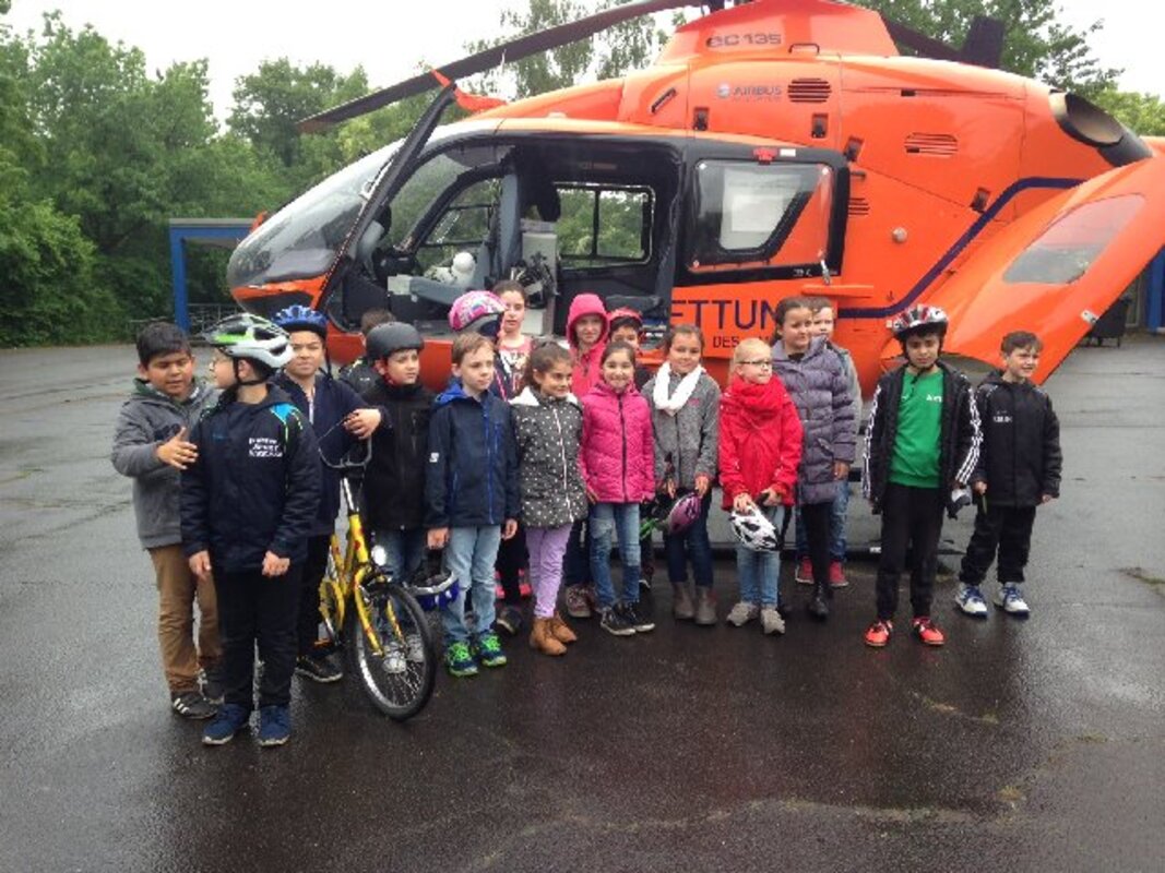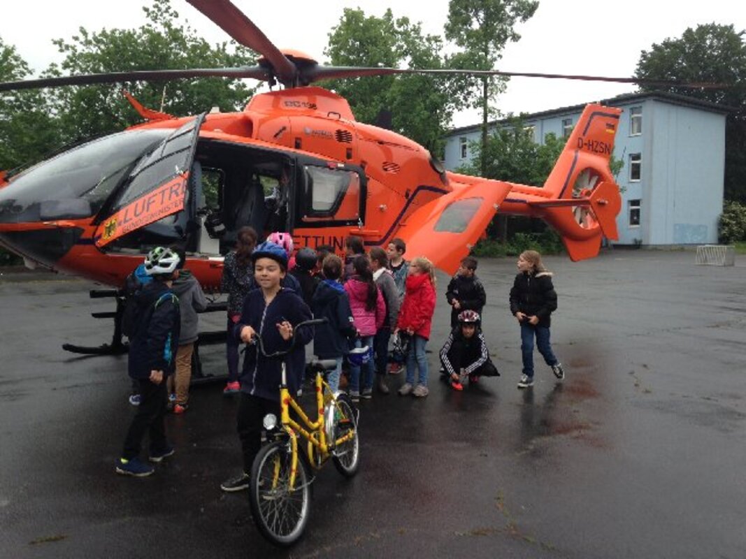 Eigentlich hatten die Kinder der Klasse 3a in der Jugendverkehrsschule Radfahrtraining auf dem Stundenplan stehen. Dann wurden sie Zeugen eines ungewöhnlichen Rettungseinsatzes. Der Rettungshubschrauber Christopher 9 landete neben dem Gelände der Jugendverkehrsschule und brachte für einen dringenden Einsatz einen Notarzt nach Walsum.