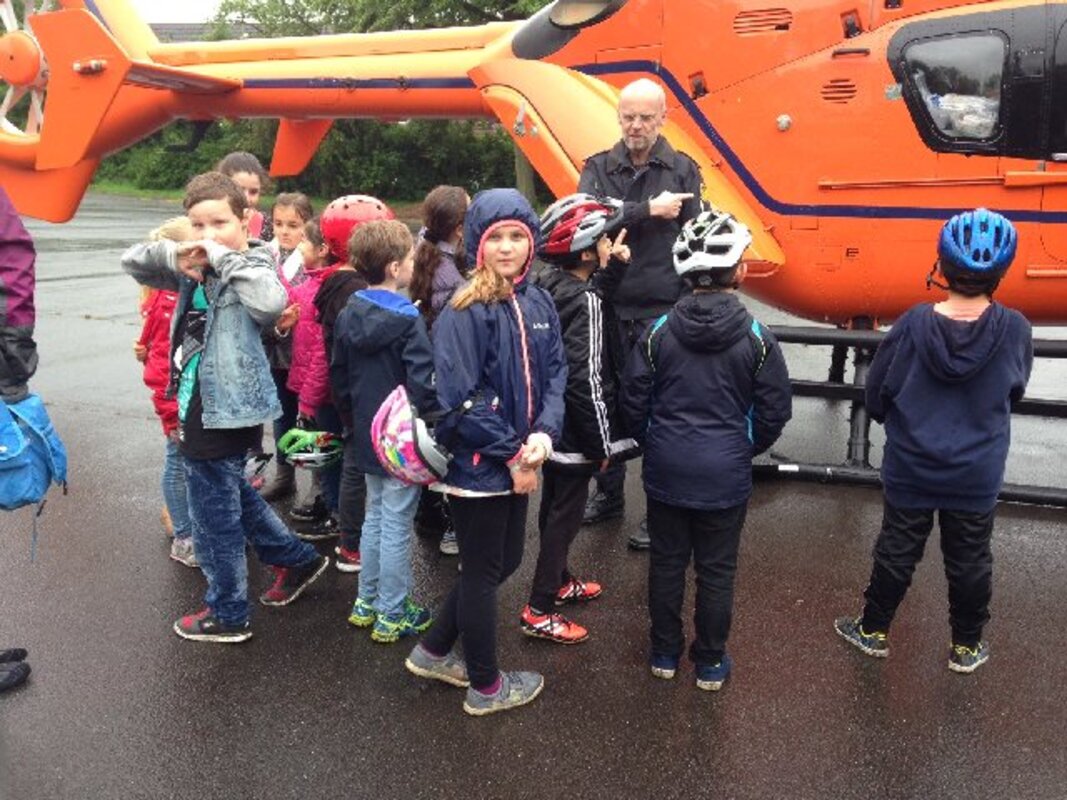 Die Crew des Rettungshubschraubers nutzte die Gelegenheit, den neugierigen Kindern etwas zu ihrer Arbeit zu erzählen. Dieses Radfahrtrainign werden die Kinder so schnell nicht vergessen.