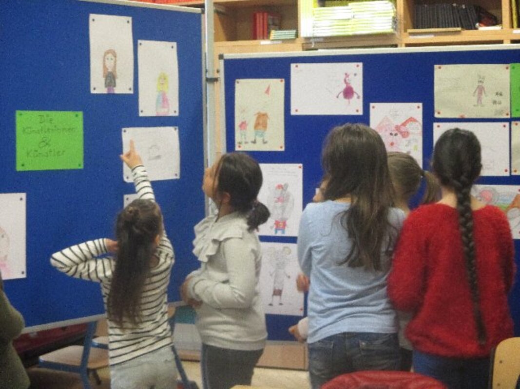 Am Mittwoch, den 25.April wurde die Kunstausstellung mit Werken unserer Comic-Kindern eröffnet. Frau Stephan, die Künstlerin, die mit 12 Kindern unserer Schule ein Comicbüchlein über unseren Ortsteil Vierlinden gestaltet hat, war bei der kleinen Eröffnungsfeier mit dabei.
