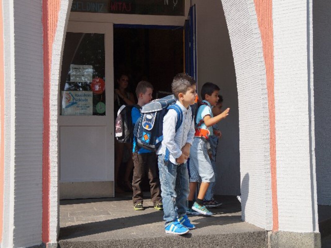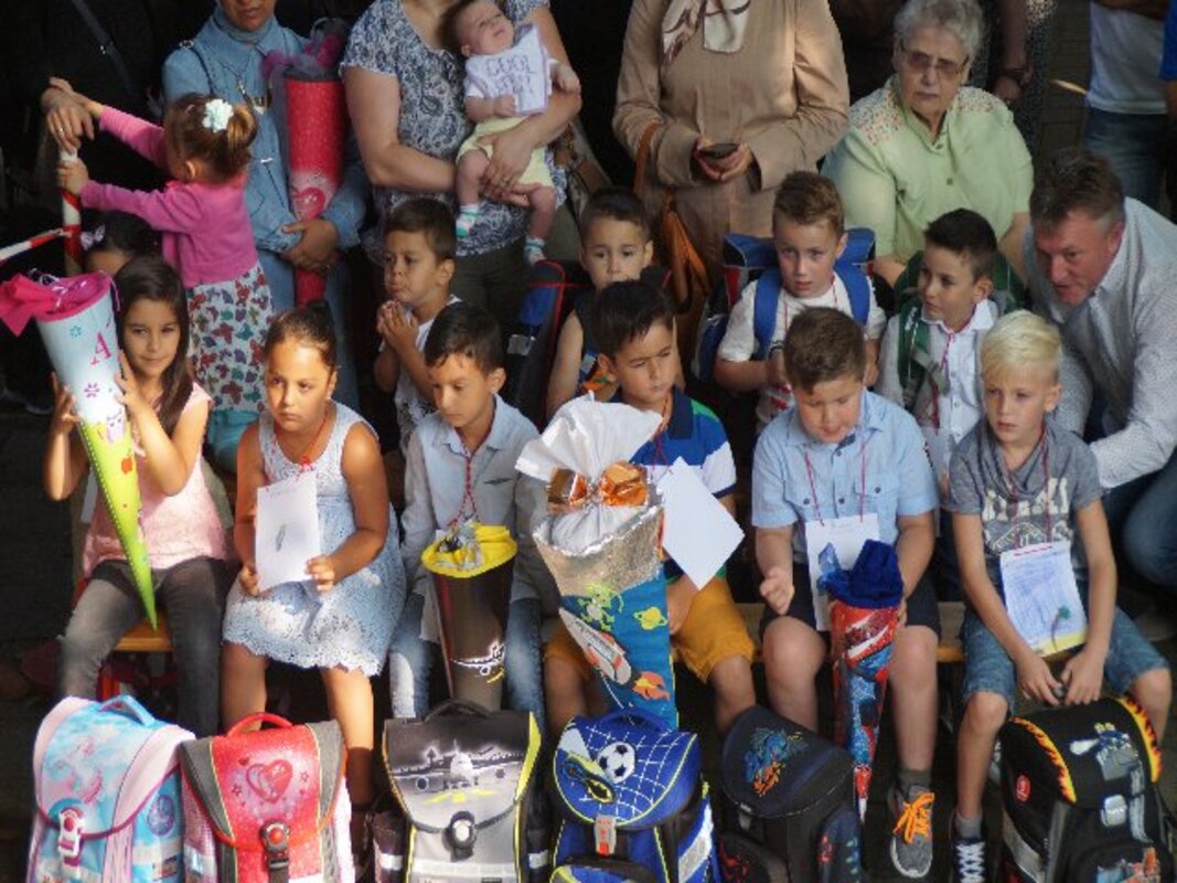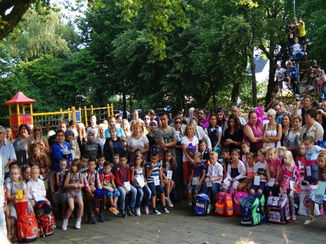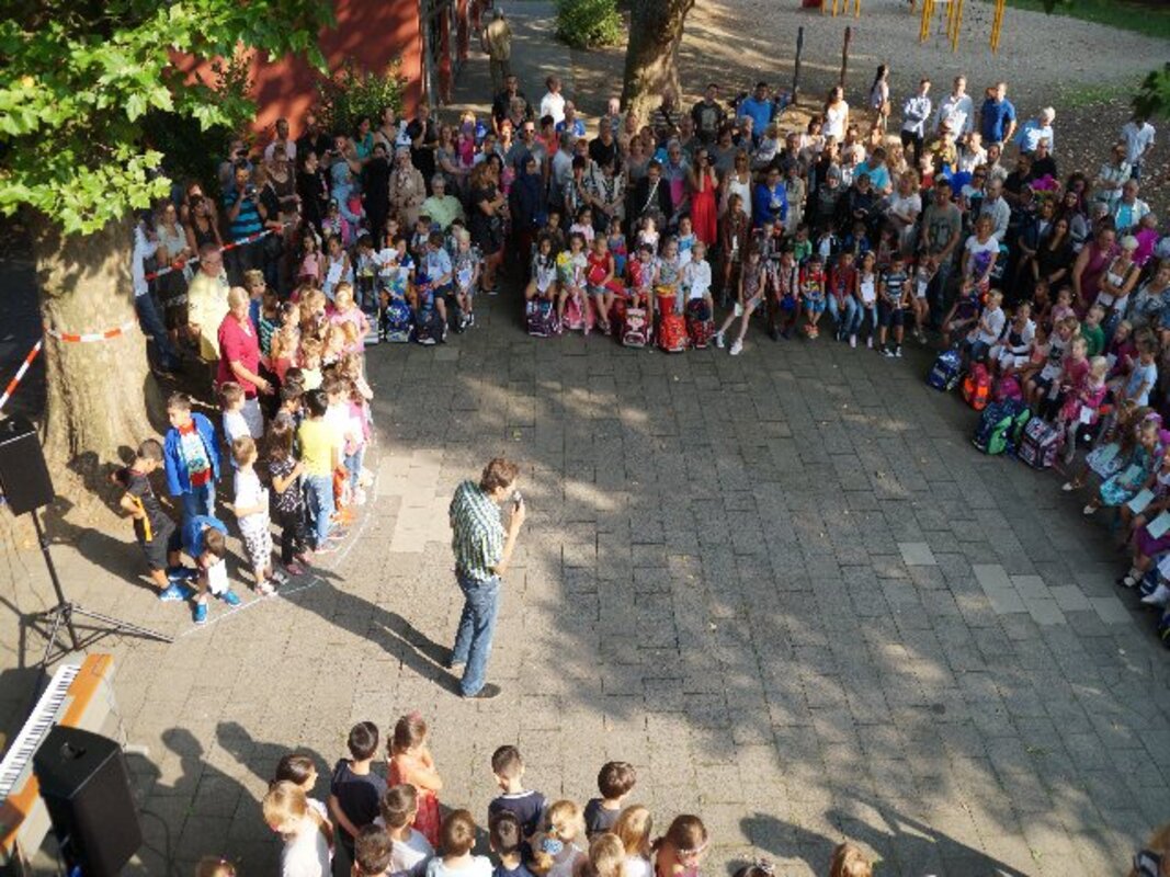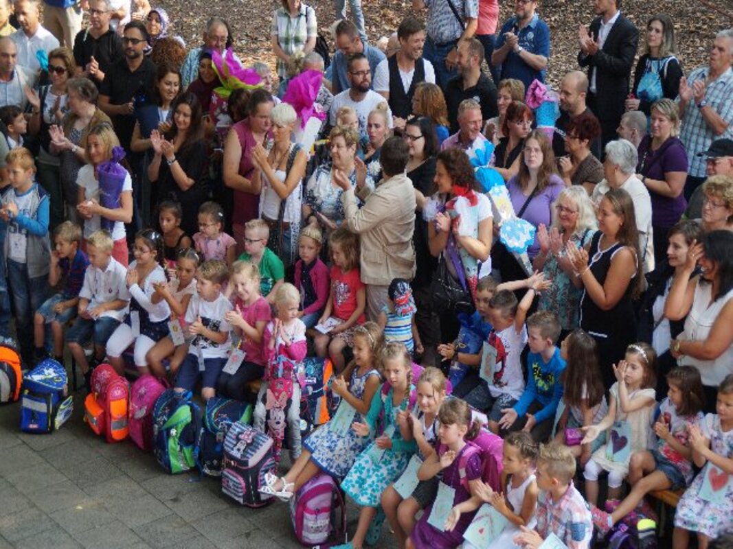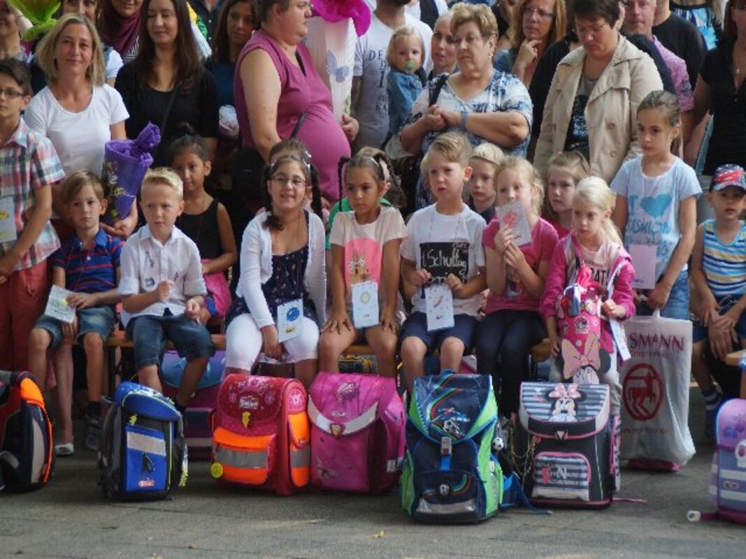 74 neue Schulkinder wurden bei strahlendem Sonnenschein am Donnerstag, den 13.August auf unserem Schulhof willkommen geheißen. Die Zweitklässler hatten ein Lied vorbereitet, die Vierklässler einen Tanz, unsere großen Patenkinder machten sich auf die Suche nach ihrem neuen Patenkind um es zum Sitzplatz zu bringen. Mit Gottes Segen, den uns Pfarrer Werth von der katholischen Kirche, Pastor Dringenberg von der evangelischen Kirche und Hoca Tamer von der Moscheegemeinde gaben, ging es nach der Einschulungsfeier ins große Schulhaus.