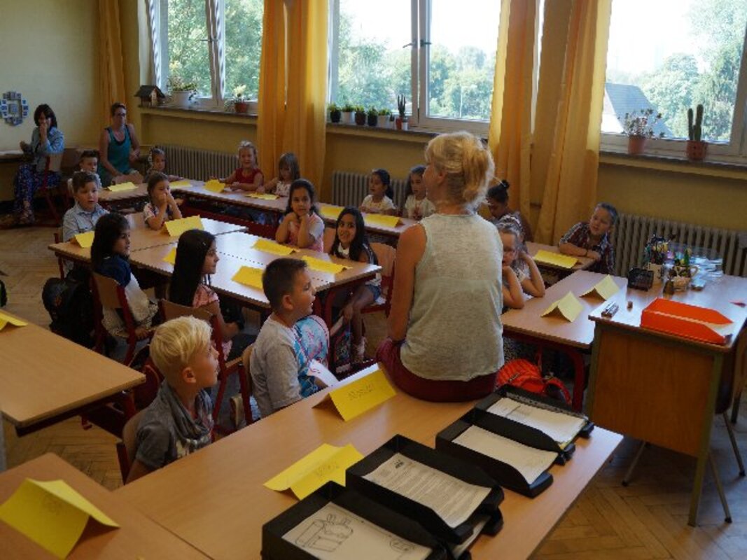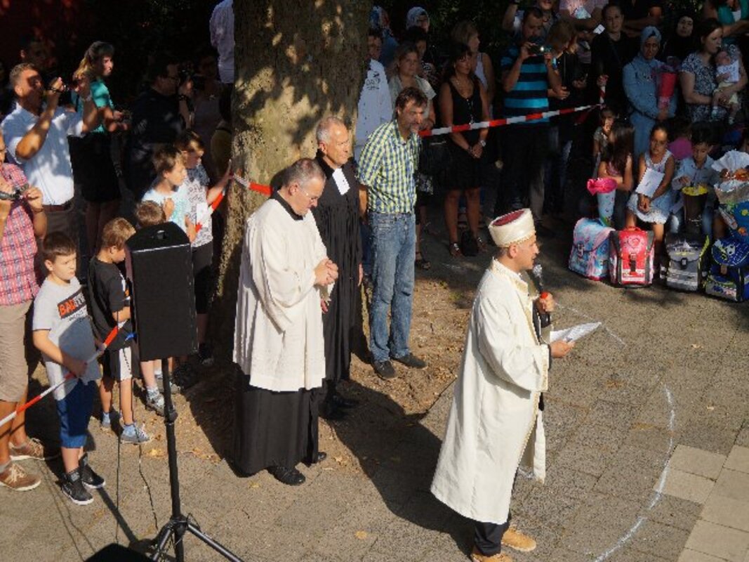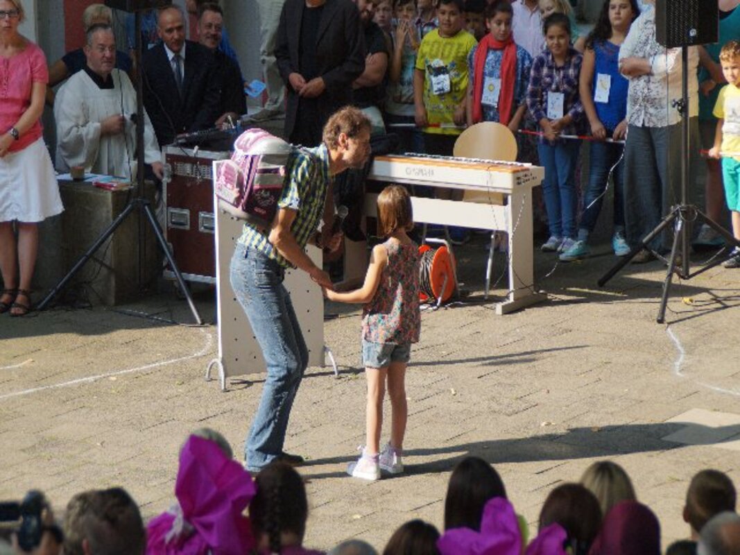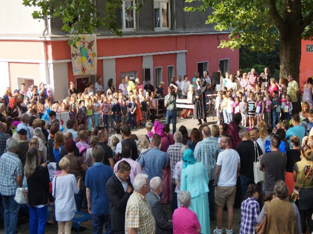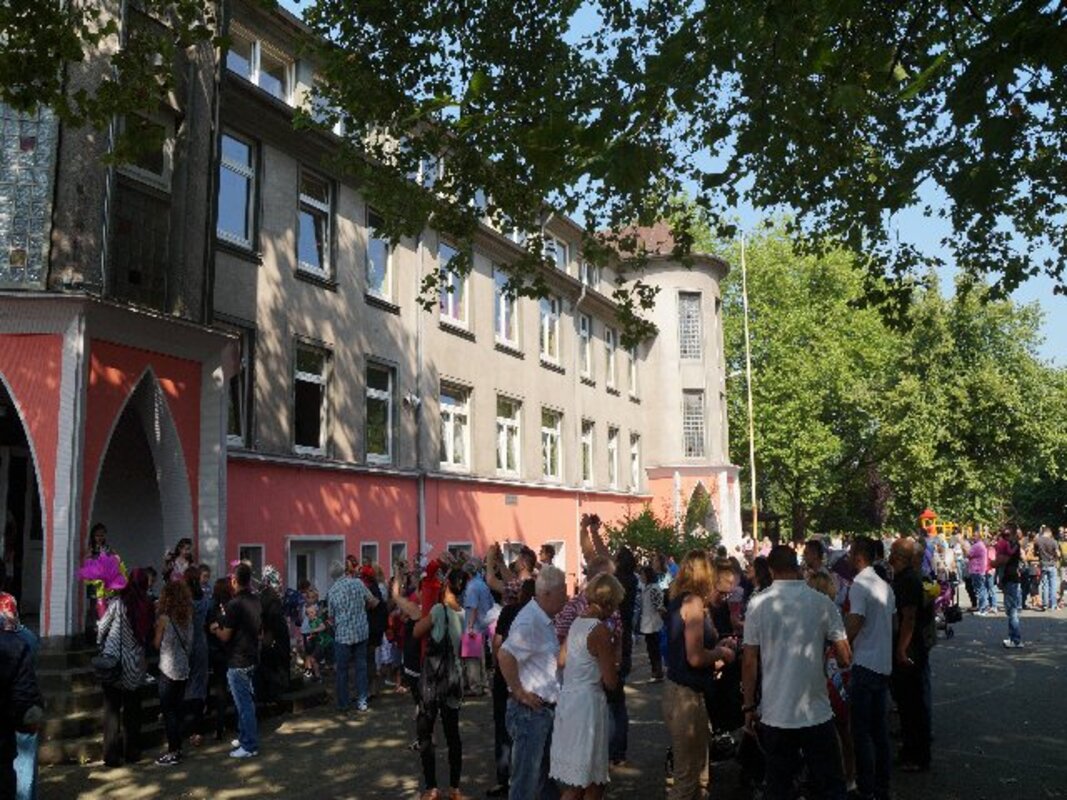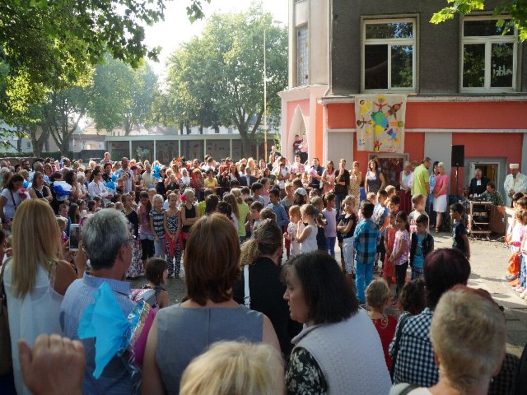 74 neue Schulkinder wurden bei strahlendem Sonnenschein am Donnerstag, den 13.August auf unserem Schulhof willkommen geheißen. Die Zweitklässler hatten ein Lied vorbereitet, die Vierklässler einen Tanz, unsere großen Patenkinder machten sich auf die Suche nach ihrem neuen Patenkind um es zum Sitzplatz zu bringen. Mit Gottes Segen, den uns Pfarrer Werth von der katholischen Kirche, Pastor Dringenberg von der evangelischen Kirche und Hoca Tamer von der Moscheegemeinde gaben, ging es nach der Einschulungsfeier ins große Schulhaus.