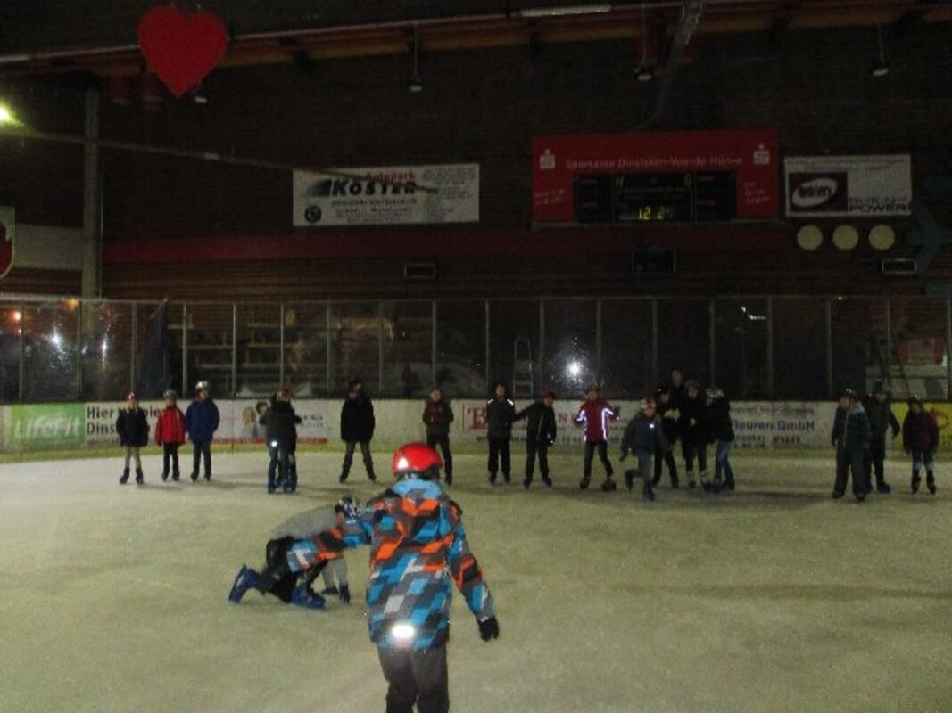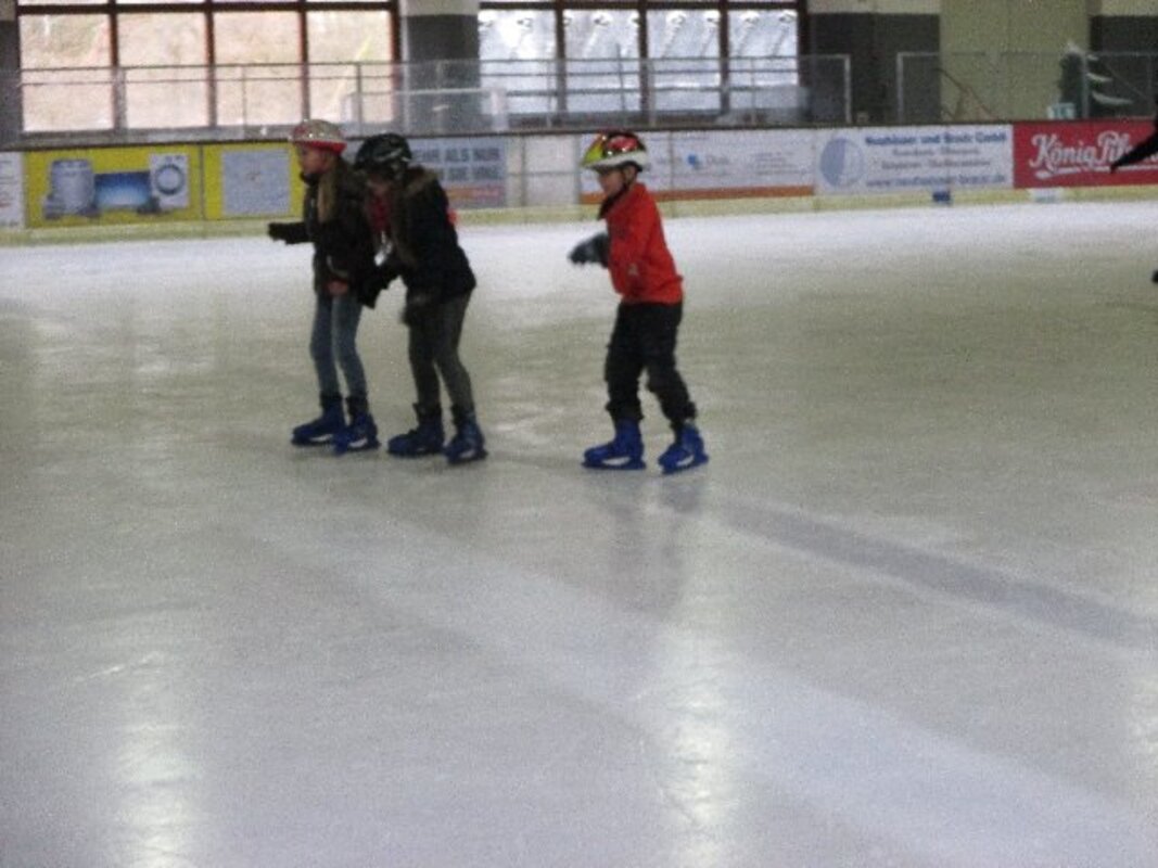 Dank der Initiative unseres neuen Sportlehrers Herrn Schwarz können wir bis zum Juni immer mittwochs mit Viertklässlern die Eissporthalle in Dinslaken nutzen. Herr Schwarz, Herr Diekmann als Schulsozialarbeiter und ein Trainer vor Ort üben mit den Kindern. Damit sich niemand verletzt, müssen Helme und Handschuhe getragen werden.