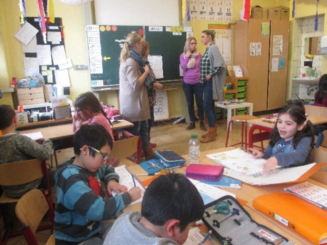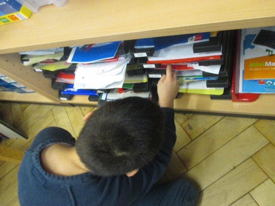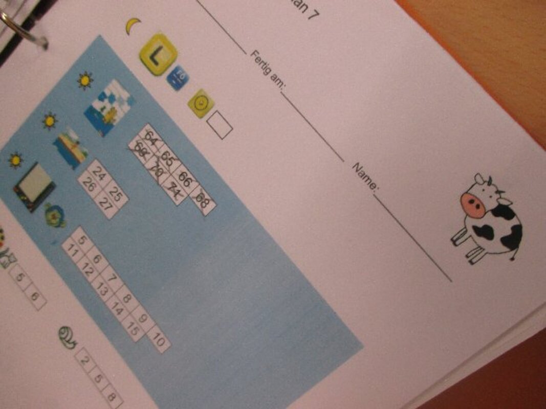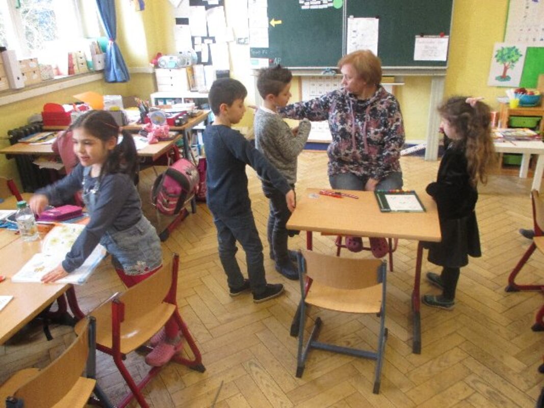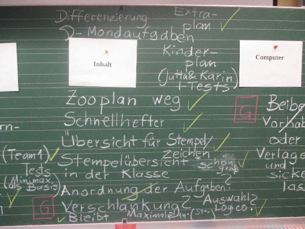 Vom späten Vormittag bis in den späteren Nachmittag wurden die Erfahrungen mit dem von uns entwickelten Mathematikarbeitsplan (Übungsplan) in Klasse 1 ausgewertet. Dafür hospitierte das ganze Lehrerkollegium in den drei ersten Klassen und ließ sich von Kindern wie Lehrerinnen zeigen, wie sie im Mathematikunterricht selbstständig ihre Arbeit organisieren.