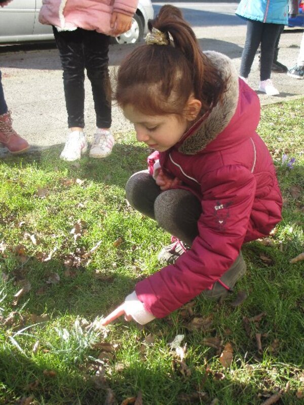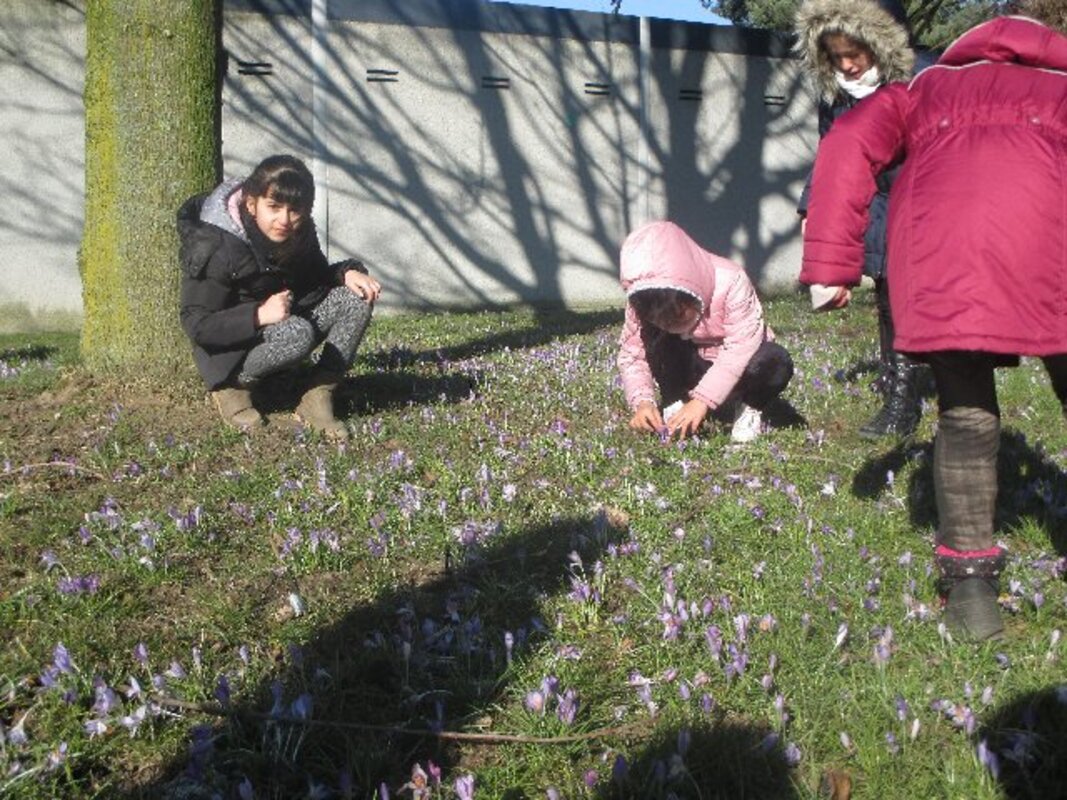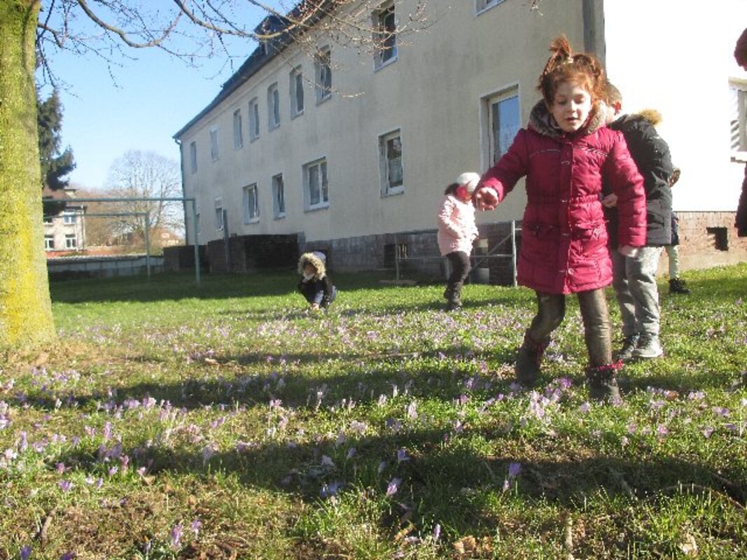 Am letzten Februarwochenende 2018 schien die Sonne und trotz der Winterkälte machten sich Ganztagskinder am Nachmittag auf die Suche nach dem Frühling. Krokusse, Gänseblümchen, Schneeglöckchen blühen schon. Den Tulpen ist das noch zu kalt.