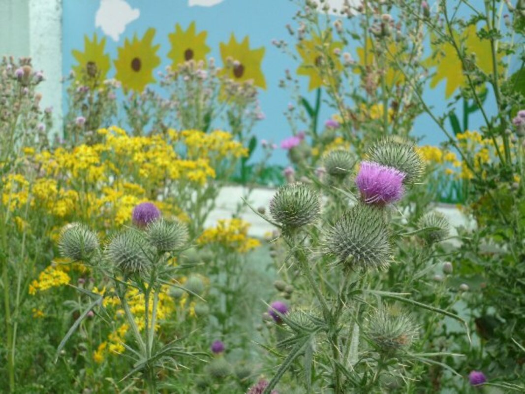 In den Beeten blühen im Wildblumenbereich die Disteln und wachsen in den Beeten die Kartoffeln, Zucchinis und Salatköpfe.