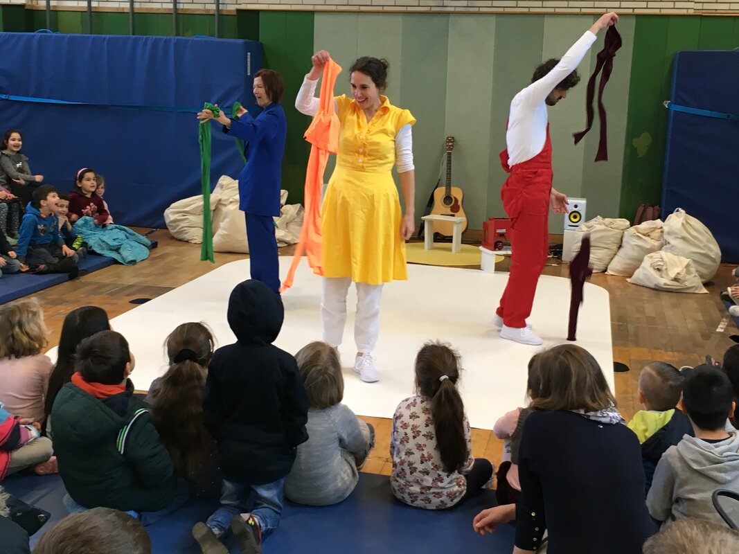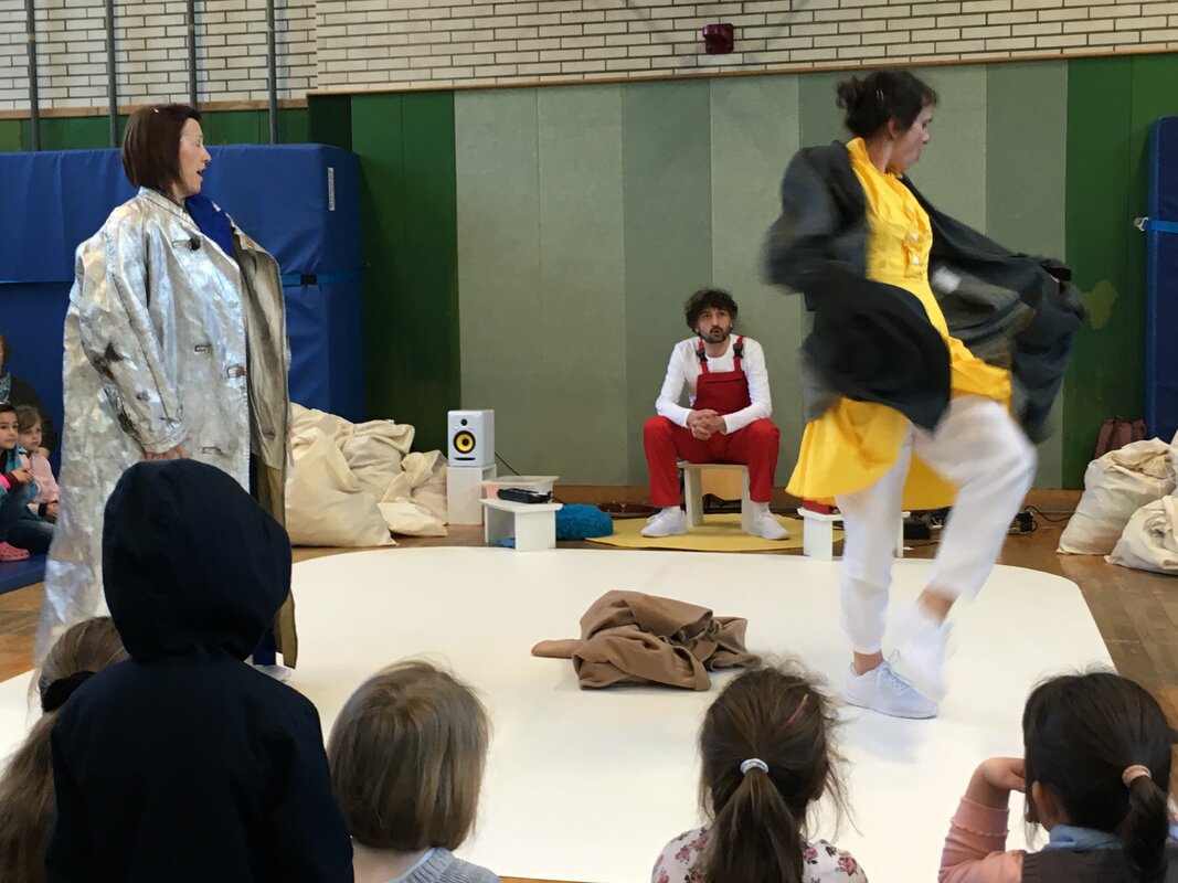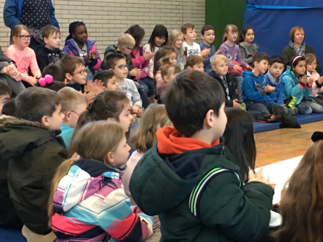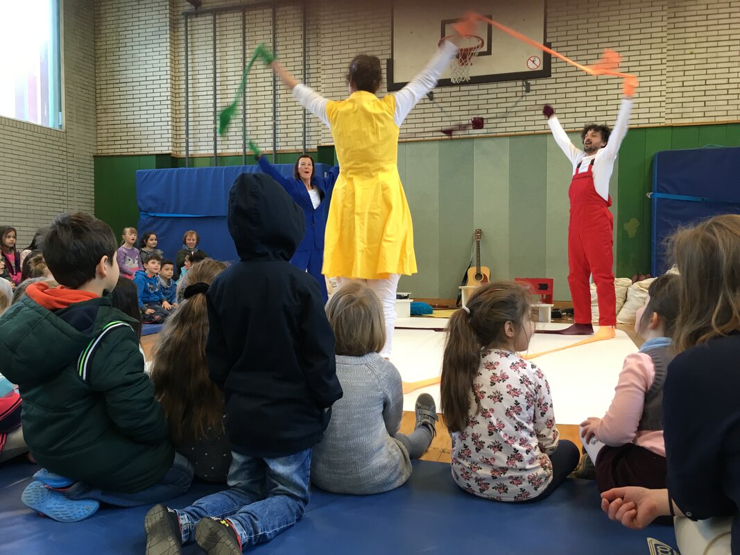 Das nagelneue Stück des bekannten Duisburger Komma-Theaters erlebten unsere 1. und 2.KlässlerInnen am 10. April in unserer Turnhalle. Zu Gast waren auch noch die Maxikinder des Kindergartens Vierlinden.