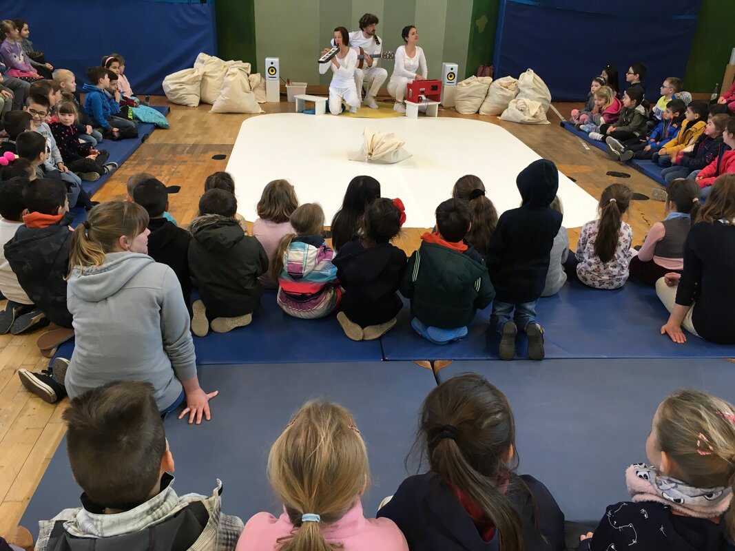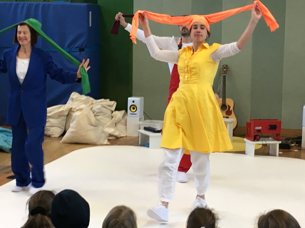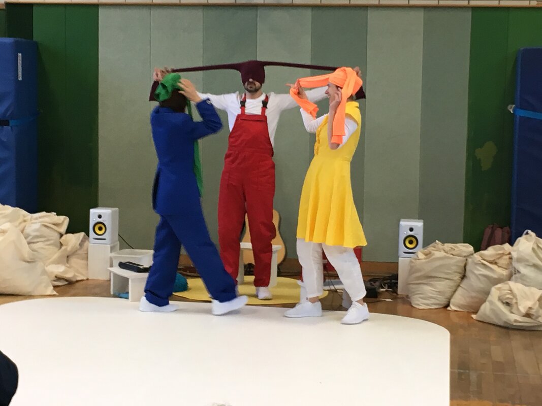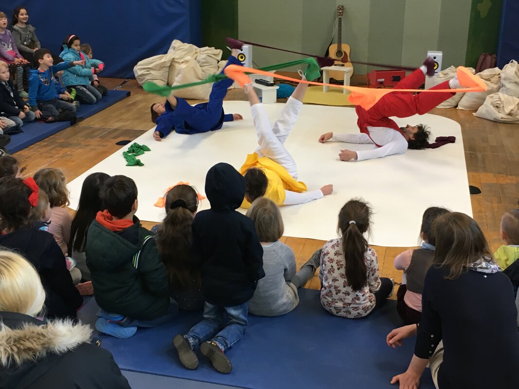 Das nagelneue Stück des bekannten Duisburger Komma-Theaters erlebten unsere 1. und 2.KlässlerInnen am 10. April in unserer Turnhalle. Zu Gast waren auch noch die Maxikinder des Kindergartens Vierlinden.