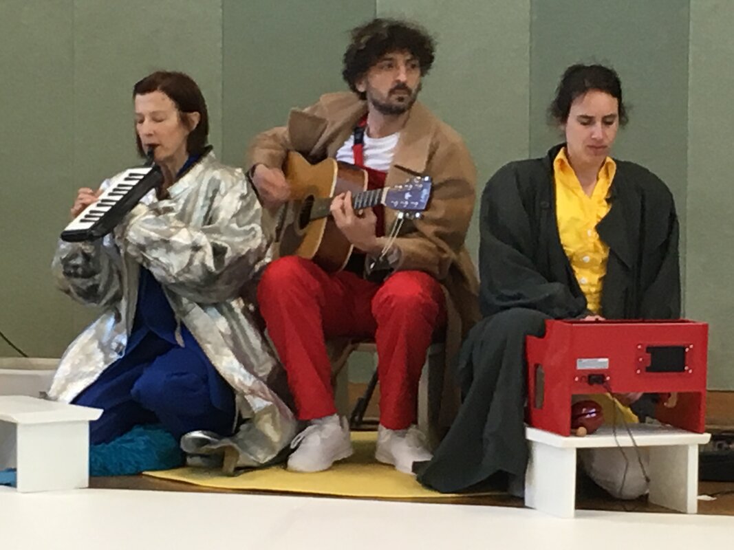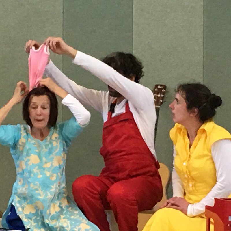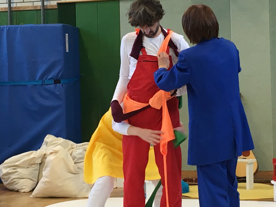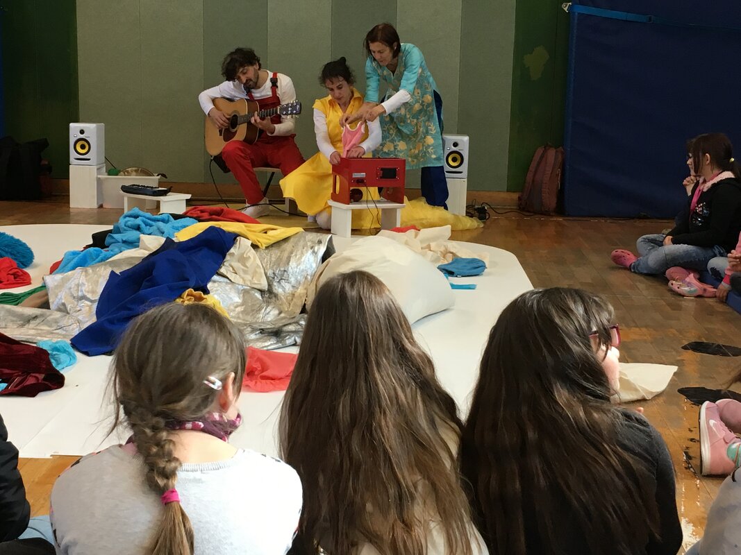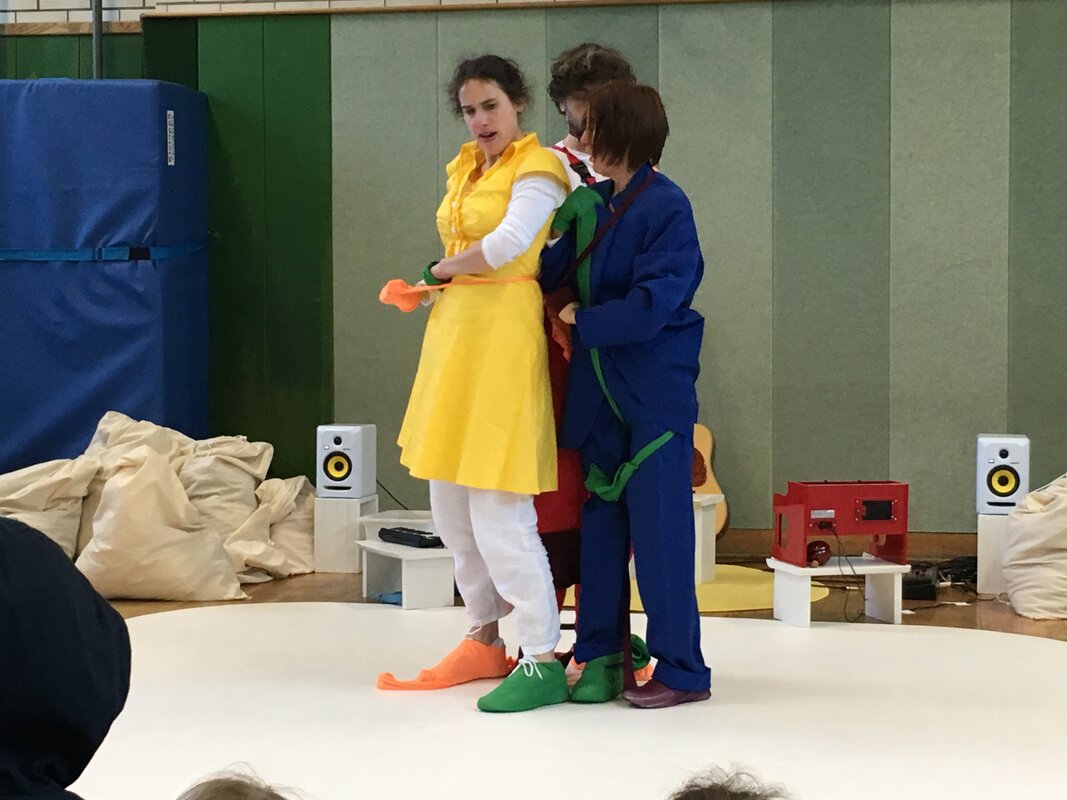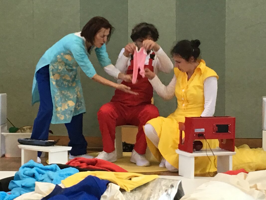 Zwei Schauspielerinnen und ein Musiker probieren an und aus und um. Dabei entstehen immer wieder neue bunte Bilder, neue Situationen. Es werden Phantasiewesen erfunden. In dem Stück, das ohne die deutsche Sprache auskommt, verspielen sich die Spielerinnen und der Musiker mit Witz und Poesie in Klamotten und Klang.