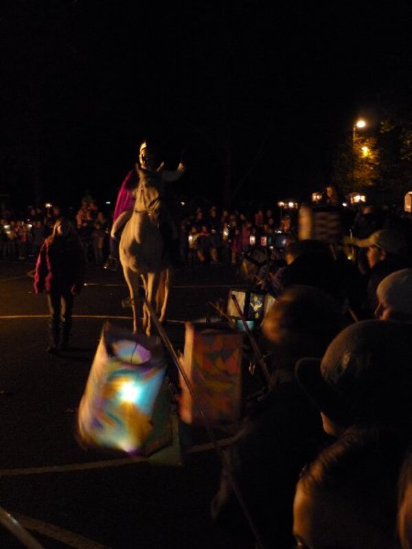 Das Wetter spielte mit und bei kaltem, aber trockenem Novemberwetter zog St.Martin gefolgt von den 13 Schulklassen und den beiden Martinskapellen durch Vierlinden. In den kleinen Straßen Am Kirchweg und Im kleinen Feld hatten etliche Anwohner ihre Fensterscheiben geschmückt. Auf dem Schulhof erwartete die Kinder dann das große Martinsfeuer.