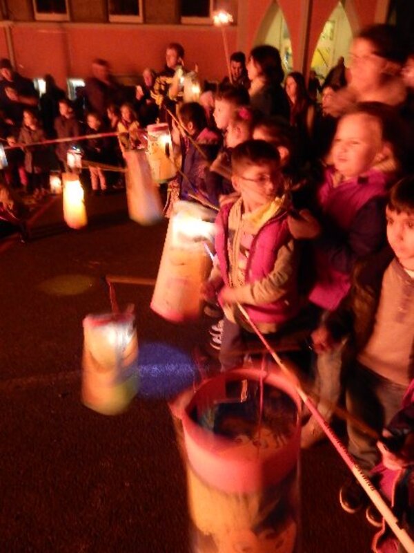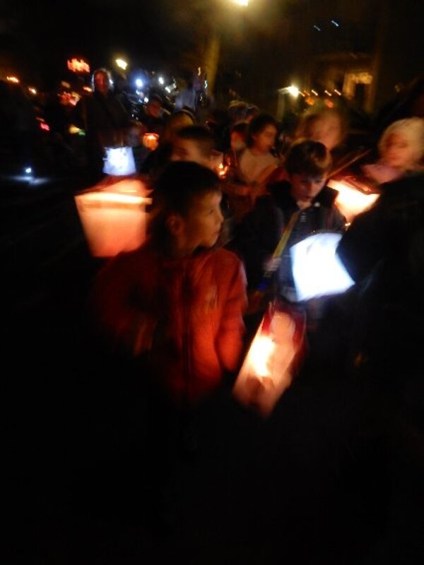 Mit Beginn der Dämmerugn sammelten sich alle Schulklassen zum langen Martinszug und zogen hinter St.Martin mit dem Pferd begleitet von zwei Musikkapellen durch die engen Straßen Vierlindens.
