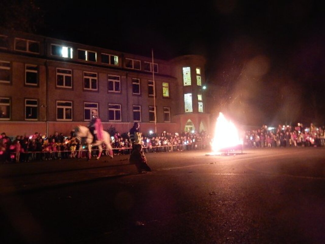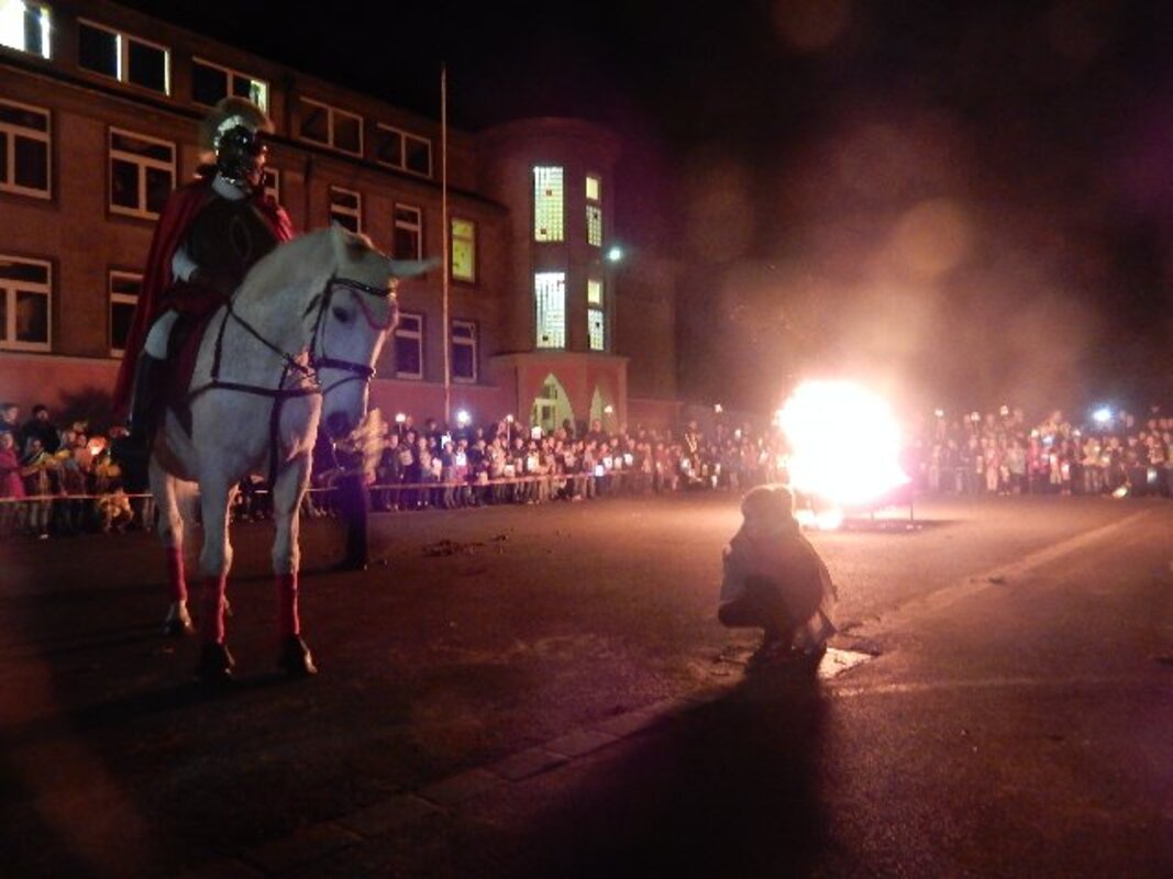 Der traditionelle, große Martinzug fand in diesem Jahr am 12.November statt. Die Erstklässler trafen sich vor dem Martinszug zu einer kleinen Feier in der Aula, die aktueller denn je war. Schließlich gab es nicht nur vor 2000 Jahren Bettler, sondern insbesondere durch viele vor dem Krieg flüchtende Menschen erleben Kinder (und Erwachsene) hautnah, dass Barmherzigkeit nötiger ist denn je.