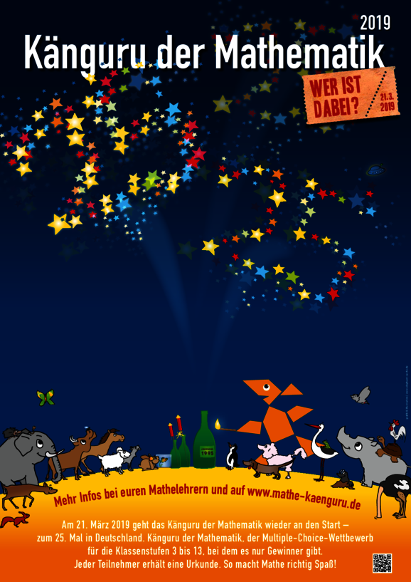Auch in diesem Jahr beteiligen sich am 21.März 2019 pro Klasse 3 bis 4 Kinder am internationalen Mathematikwettbewerb Känguru der Mathematik. Ziel des Wettbewerbes ist es, Freude an mathematischem Denken und Arbeiten zu wecken und vor allem leistungsstarke Kinder herauszufordern. Bei den meisten Aufgaben braucht man gesunden Menschenverstand, Kreativität und Pfiffigkeit, vor allem aber ein tiefes mathematisches Verständnis. Rechnen allein reicht nicht. Der Wettbewerb feiert in diesem Jahr seinen 25.Geburtstag und wird in 70 Ländern der Welt gleichzeitig durchgeführt. Allein in Duetschland nehmen über 900.000 Schülerinnen und Schüler der Klassen 3 bis 13 daran teil.