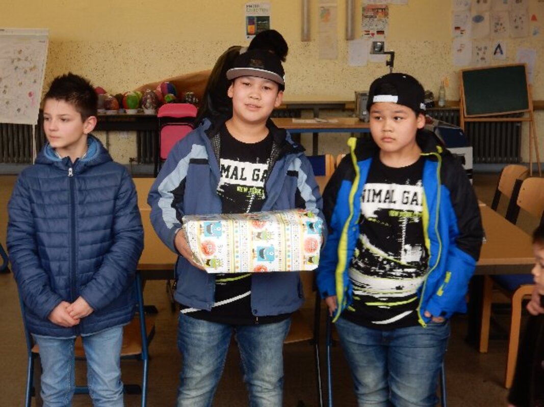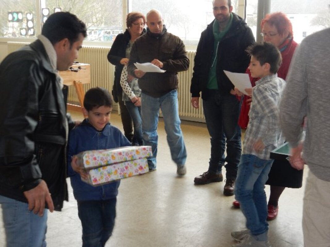 Da kurz vor den Osterferien die Schule auch noch Geld aus einer Stiftung für Spielmaterialien für Flüchtlingskinder in Walsum bekommen hatte, konnten die Geschenkpakete für die 12 Familien mit bis zu 4 Kindern etwas größer ausfallen.