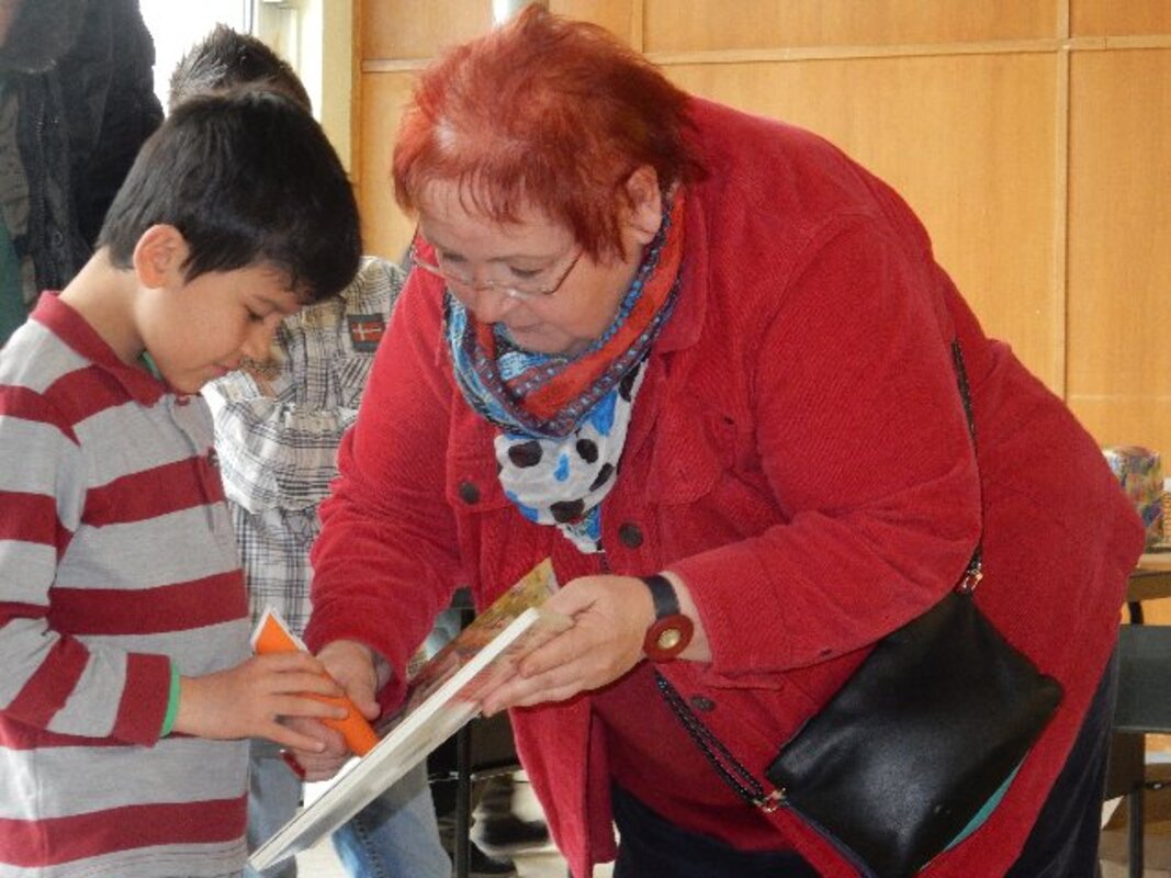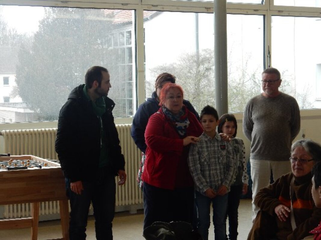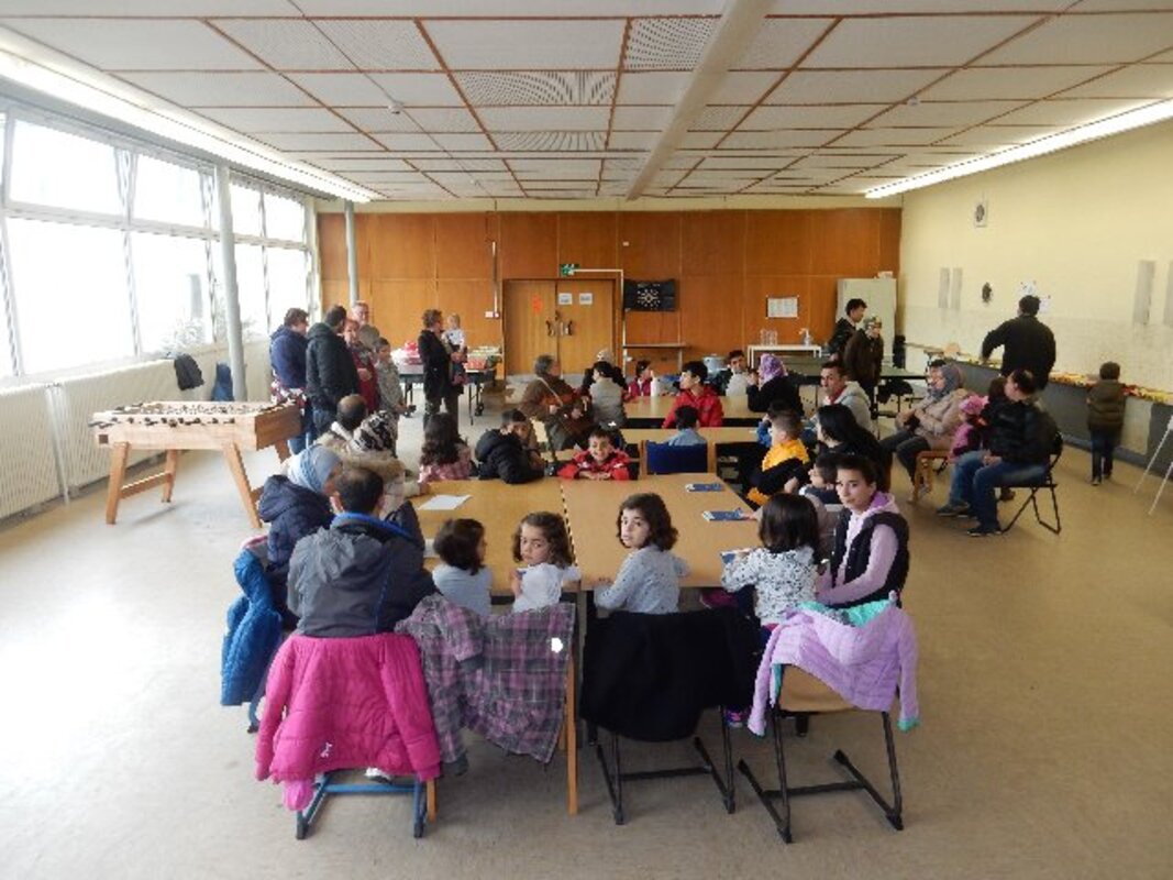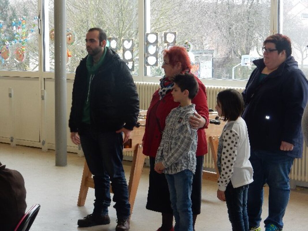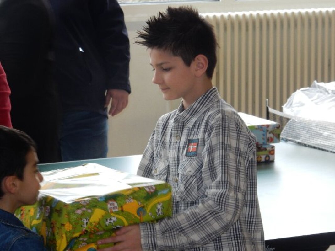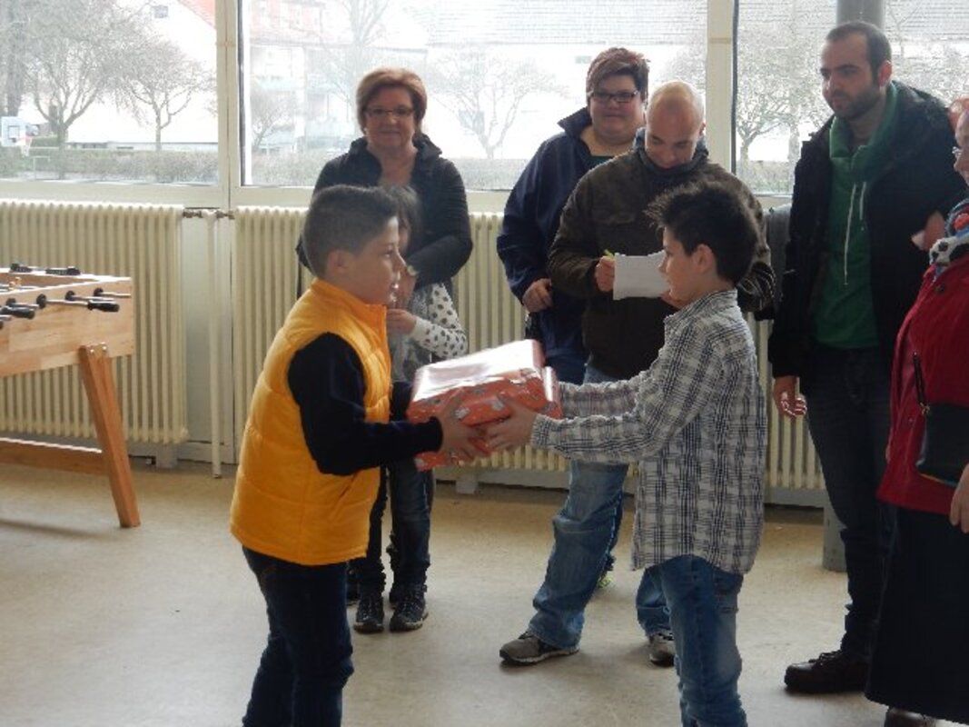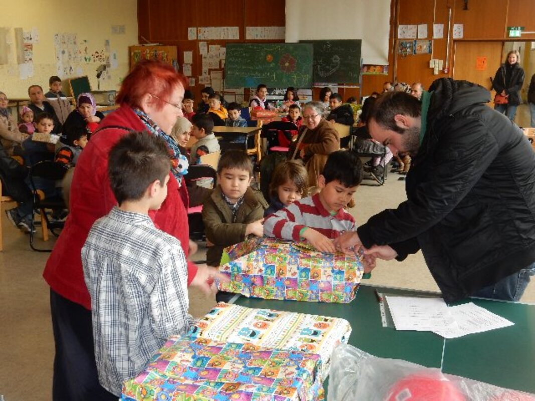 Insgesamt 12 Familien mit Kindern im Grundschulalter, vorwiegend aus den Kriegsgebieten in Syrien und aus Afghanistan geflohen, freuten sich als Johannes und seine kleine 6jährige Schwester Schwester Mia am 31. März in der Aula der Frankenschule Geschenkpakete überreichten.