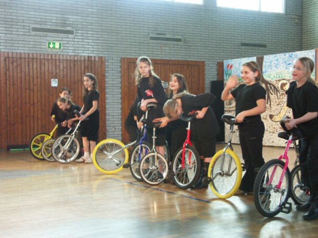 Die Werkschau zum Thema "Erde" war voller Akrobatik und Tempo. Vor allem die Mädchen hatten sich diesmal ins Zeug gelegt und fleißig geübt. Vor einem großen Publikum präsentierten die Kinder Kunststücke beim Einradfahren, beim Jonglieren mit den Besen oder den Devilsticks oder bei der Gymnastik mit bunten Bändern oder den Reifen.