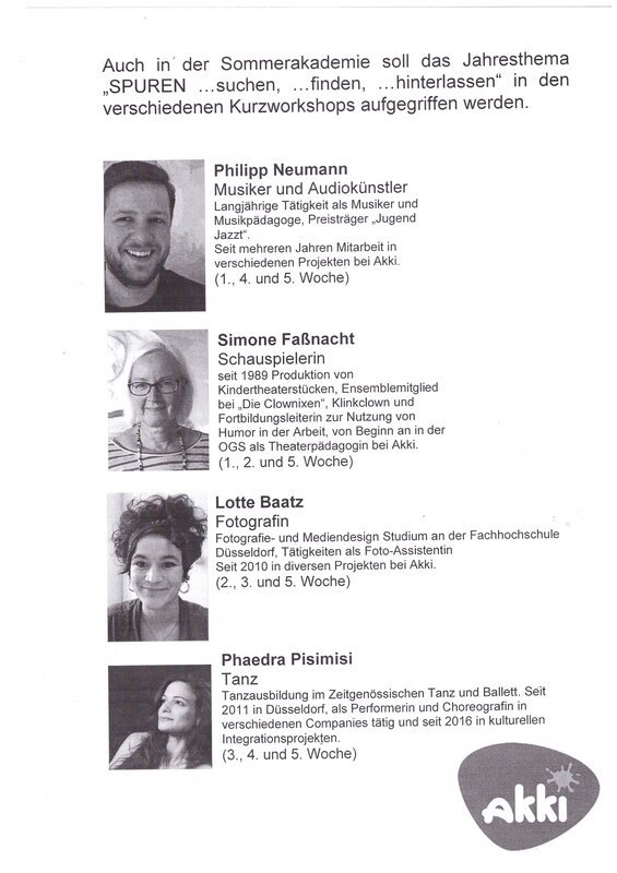5 Wochen lang von Ende Mai bis Ende Juni sind jeweils für eine Woche immer drei verschiedene Künstelerinnen oder Künstler im Nachmittagsangebot von Akki. Egal ob es sich um Schaupiel, Hörspiel, Fotografie, Tanz oder Musik dreht, immer geht es um das Jahresthema Spuren suchen, finden und hinterlassen.