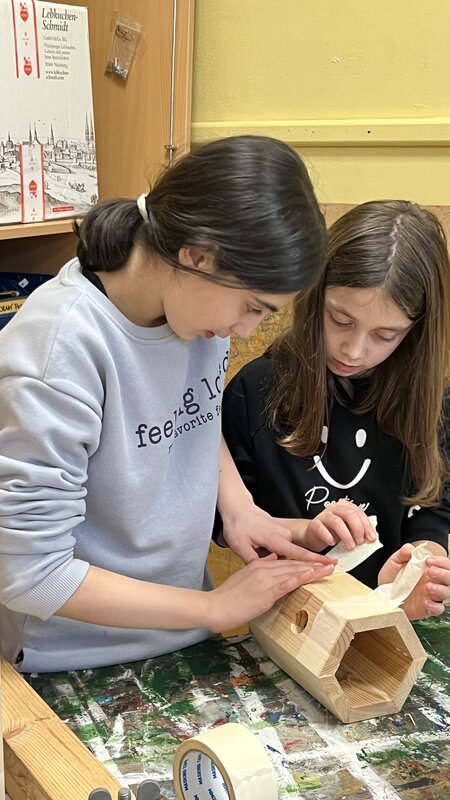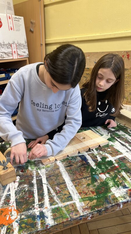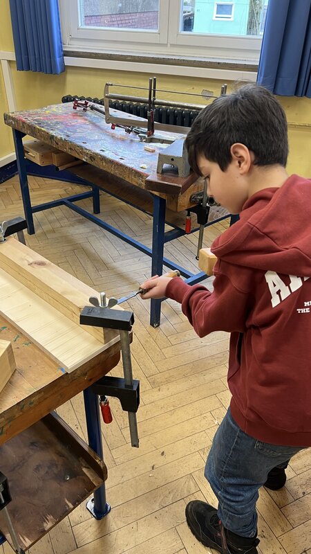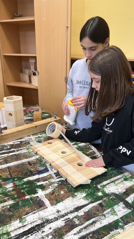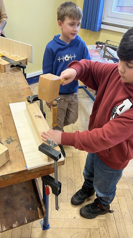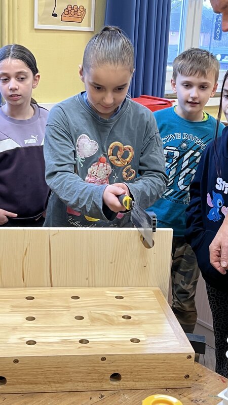 Im Februar hat ein Bauprojekt im Offenen Ganztag begonnen. Die Kinder bauen dort unter Anleitung eine Spielburg aus Holz. Es wird gesägt, gebohrt und geklebt und die Kinder haben viel Spaß dabei. Sie lernen dabei handwerkliche Fähigkeiten und Teamwork. Das Projekt läuft noch bis Mai.