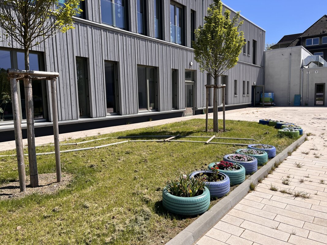 Nach der langjährigen Baustelle auf unserem Schulgelände und der Umgestaltung des Schulhofs wird jetzt, pünktlich zur Gartensaison, wieder ein Schulgarten auf unserem Schulgelände angelegt. Die ersten Ideen sind bereits auf den Fotos erkennbar. So wurden Autoreifen bunt gestaltet und mit Frühlingsblumen bepflanzt. Ein Barfußpfad befindet sich gerade im Bau. Material für Hochbeete und Sitzmöglichkeiten wurden bereits gespendet und von den Kindern bearbeitet. Von der Stadt Duisburg konnten wir im Rahmen des Projekts “Duisburg giesst” einen Wasserkanister, der mit Regenwasser gefüllt wird, bekommen. Danke an alle SpenderInnen!