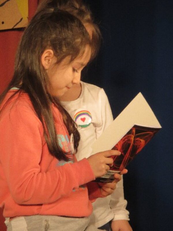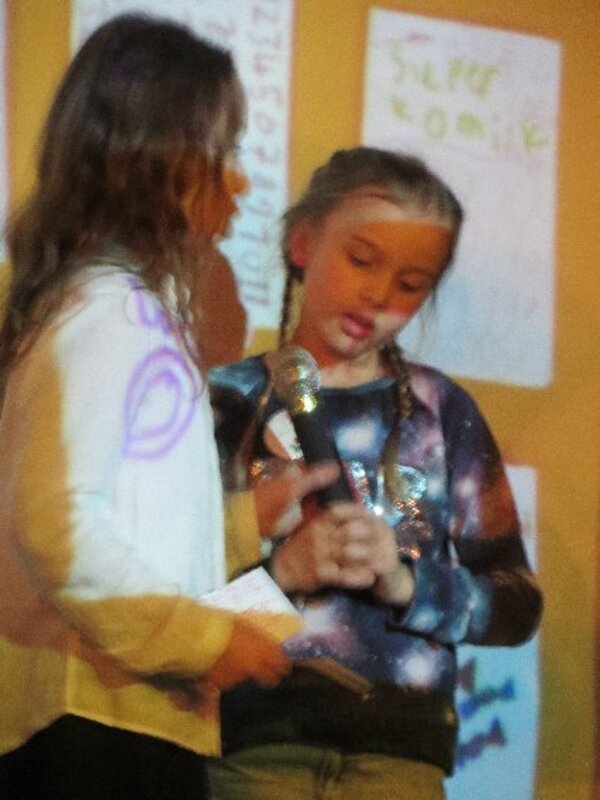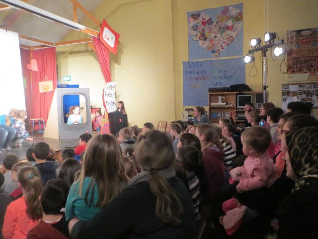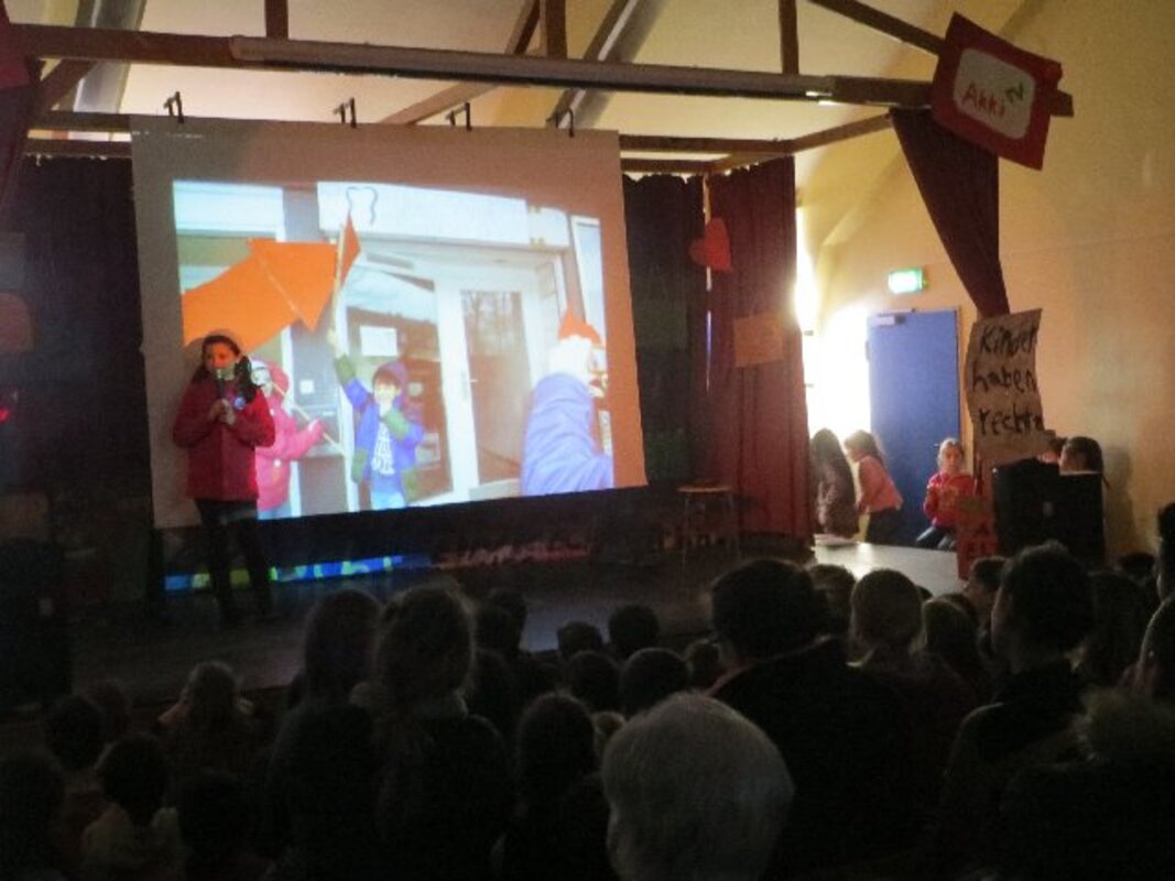 Die zweite Workshopphase endete am ersten Märzmittwoch mit der Werkschau der Akki-Ganztagskinder zu den Kinderrechten. Fast eine ganze Schulstunde gestalteten die Kinder mit etwas Hilfe eine komplette Werkschau in der gut gefüllten Aula selbst. Filmausschnitte aus dem AKKI-TV von der Kinderdemonstration zum Franz-Lenze-Platz, kleine Spielszenen zu verschiedenen Kinderrechten, die selbst gedichteten Strophen zum Kinderrechtelied und Fotos von den vielen Kunstwerken aus Knete und Papier sorgten für viel Abwechslung in einer Werkschau, die den Erwachsenen Freude machte. Schließlich erlebten sie selbstbewusste Kinder, die deutlich machten, was gemein ist und was nicht.