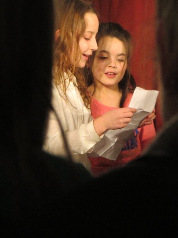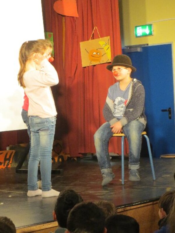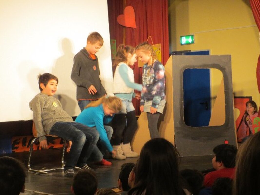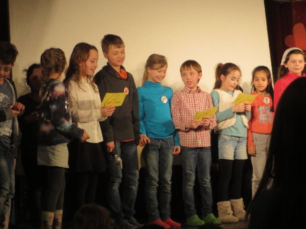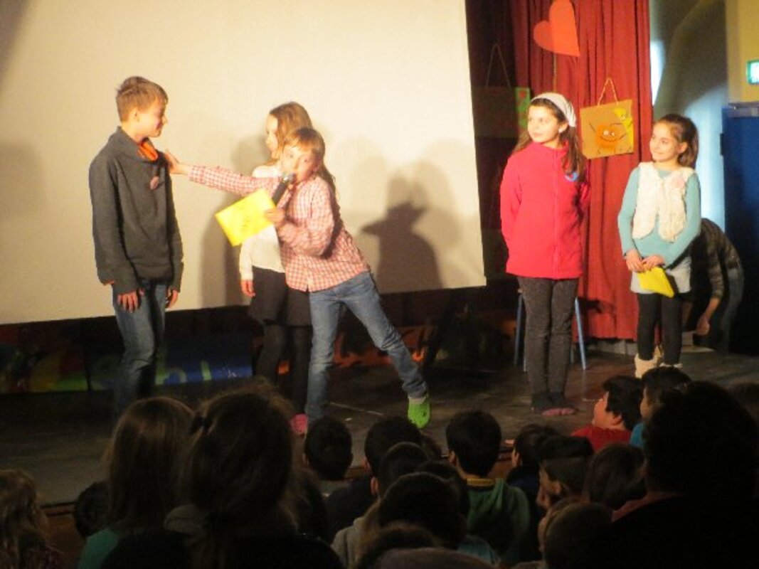 Die zweite Workshopphase endete am ersten Märzmittwoch mit der Werkschau der Akki-Ganztagskinder zu den Kinderrechten. Fast eine ganze Schulstunde gestalteten die Kinder mit etwas Hilfe eine komplette Werkschau in der gut gefüllten Aula selbst. Filmausschnitte aus dem AKKI-TV von der Kinderdemonstration zum Franz-Lenze-Platz, kleine Spielszenen zu verschiedenen Kinderrechten, die selbst gedichteten Strophen zum Kinderrechtelied und Fotos von den vielen Kunstwerken aus Knete und Papier sorgten für viel Abwechslung in einer Werkschau, die den Erwachsenen Freude machte. Schließlich erlebten sie selbstbewusste Kinder, die deutlich machten, was gemein ist und was nicht.